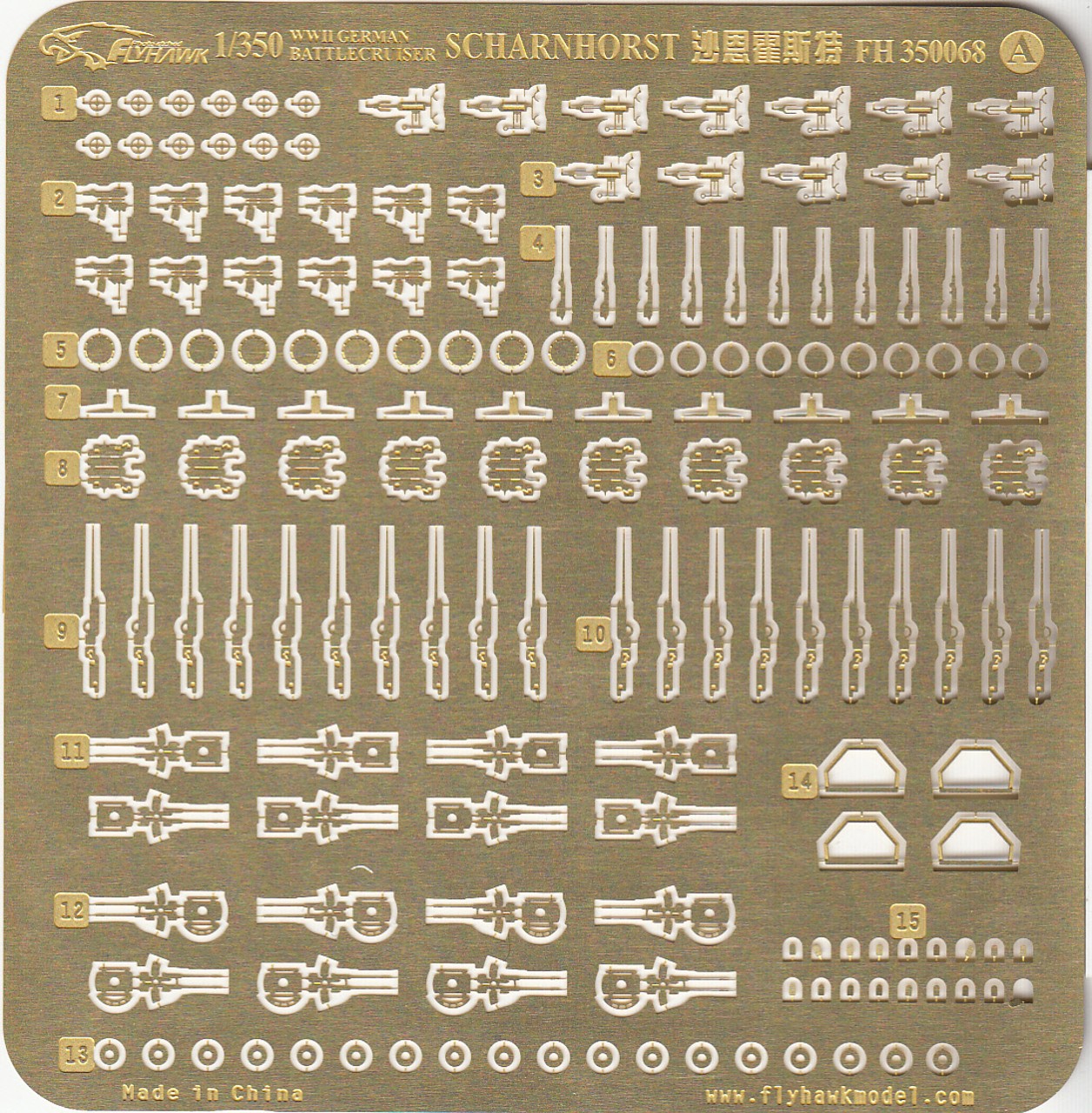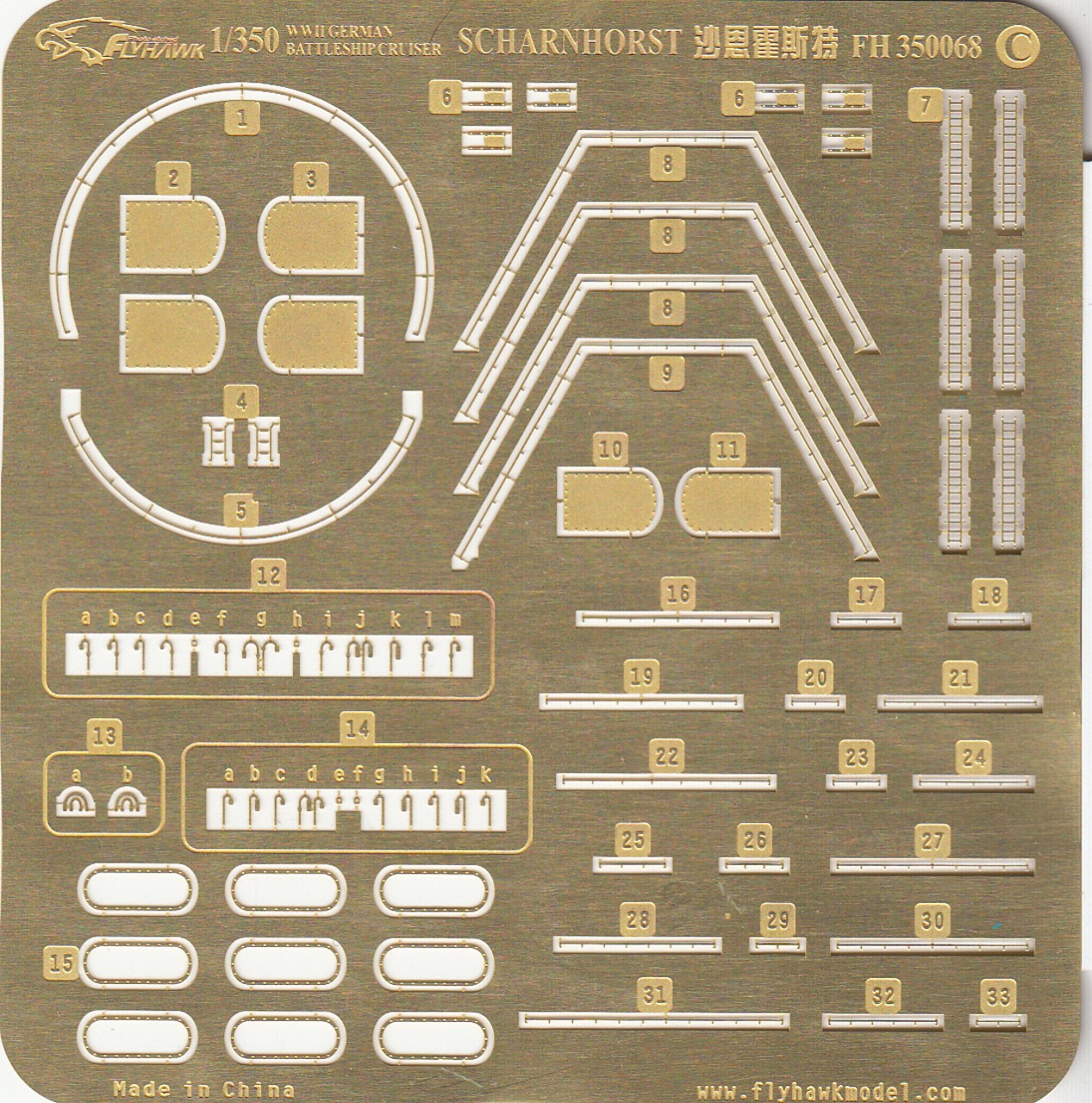 Poněkud menší set přinesl před časem anglický WEM, kterou ocení hlavně začínající modeláři. S výrobky této firmy mám ty nejlepší zkušenosti. Na model pasují velice přesně, jsou jednoduše konstruovány a cena zvláště tohoto setu Vaše peněženka určitě unese. O kvalitě materiálu a provedení je asi zbytečné psát. Tento set nabízí jen to nejzákladnější zábradlí, záchranné čluny, radary ... Co, ale potěší stavitele dřívějších verzí modelu, je to, že se na plechu nachází jak orlice, tak i znaky na příď lodě jak Scharnhorstu tak i sesterské Gneisenau.