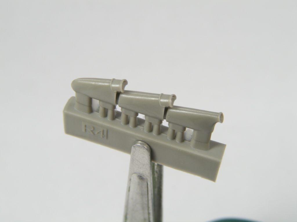 Jednoduchý doplněk nahrazuje výfuky. Díly stačí uříznout a přilepit na své místo. Stejně jako v předchozím případě je vše bezvadně odlito. Výfuky mají zahloubená ústí a jemně naznačené sváry.