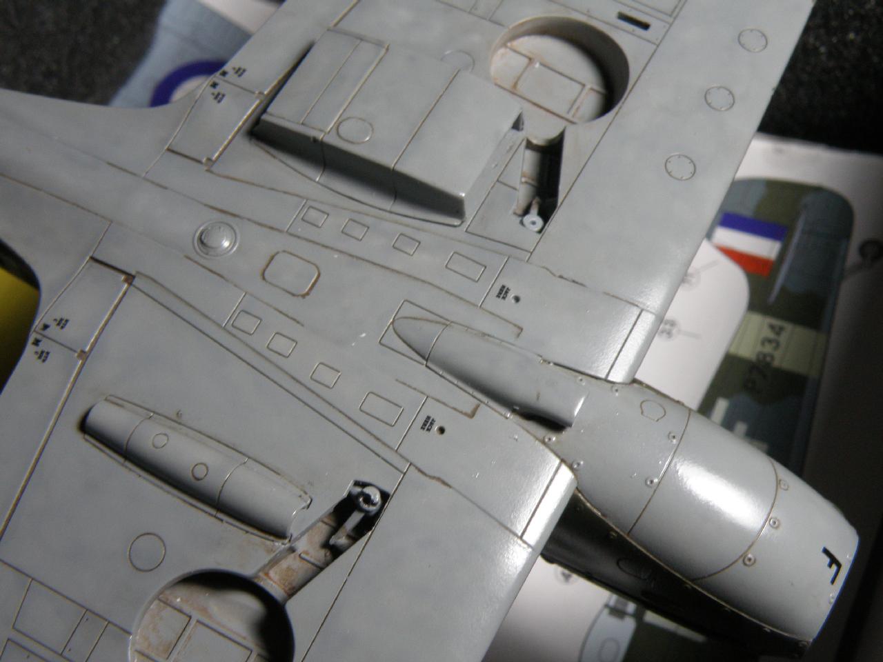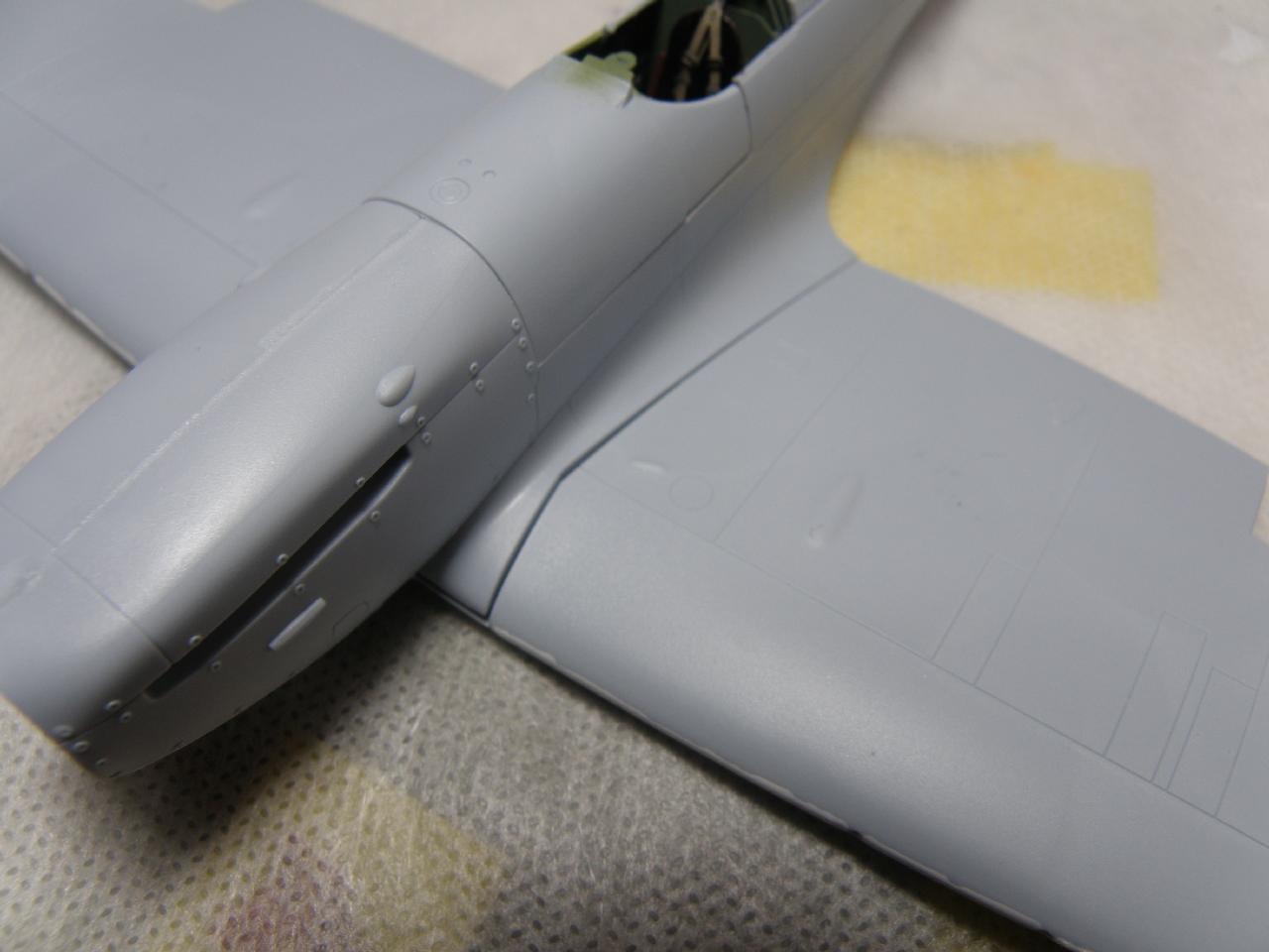 Přilepením křídla, výškovek a chladičů máme hrubou stavbu Tamiyácké jedničky hotovou. Airfixí jednička má v této fázi ještě několik dílů. Výškovky a směrovka se lepí stejný způsobem jak Edí, stejně tak křidélka. V přední části ještě nalepíme díly (G26) sání (G21 a G27) chladiče a máme připraveno na barvení. Samozřejmostí je nalepení a zamaskování kabinek.