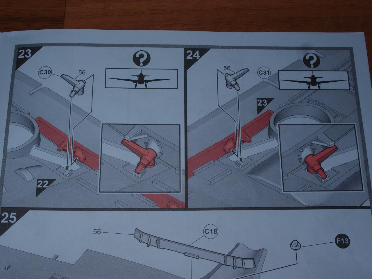 A teď asi nastává asi nejtěžší operace celé stavby, nalepení spodní části podvozku (C30 a C31) na které pak lepíme samostatné podvozkové nohy (C54 a C53), ale tady bych podle návodu nelepil. Mě se podařilo ne jedné noze zarážku odříznout a co jsem slyšel, tak samotné lepení na konci stavby je též problematické, špatně se hlídá geometrie. Takže jsou asi dva způsoby jak na podvozek. První je že podvozky slepím a pak celé nalepím do křídla a nechám po celou dobu stavby. Nebo je slepím ze spodu vyvrtám díru pak tak je dělený podvozek jej rozříznu a podvozkové nohy vlepím drátek nebo jehlu a spodní díly (C30 a C31) vlepím do křídla a na závěr stavby můžeme nalepit. Já jsem nakonec navrtal jehly do obou podvozkových noh. Ještě nezapomenout na nalepení dílu (F13) zaslepit otvory pro vypadávání nábojnic a můžeme křídlo slepit.
