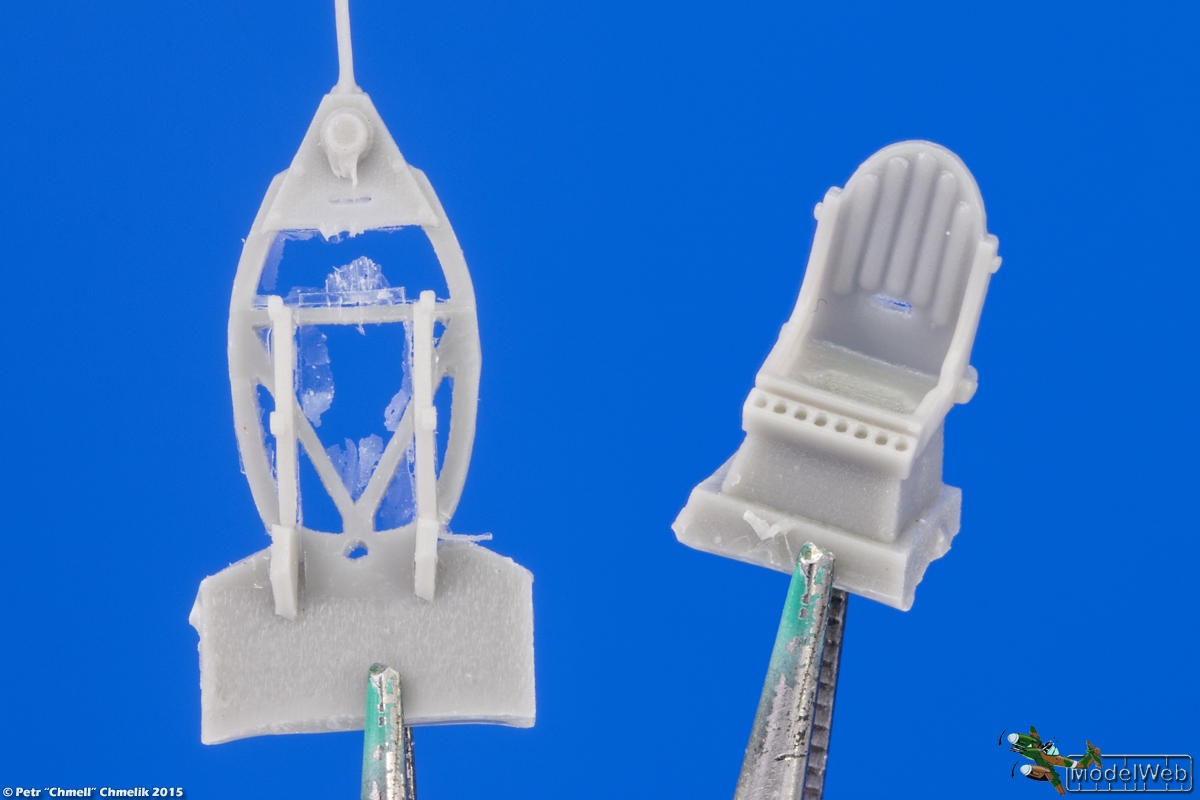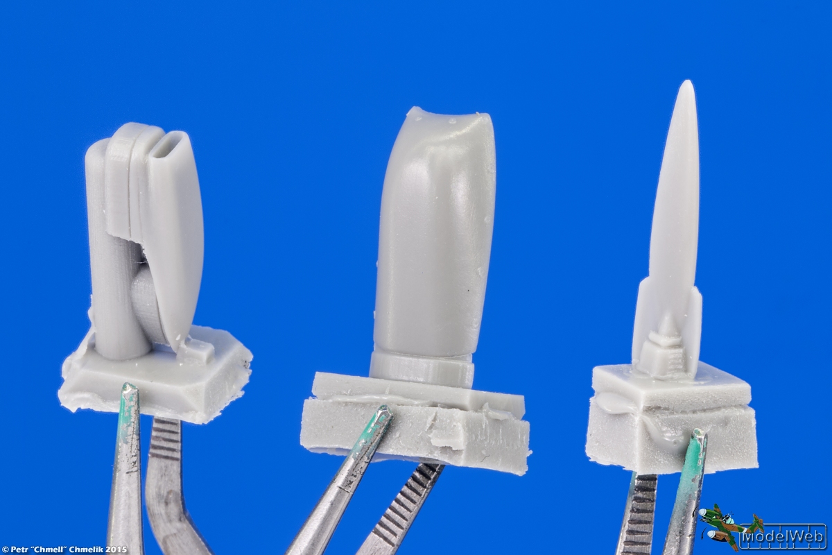 Menší díly jsou také odlity bez větších vad. Chladiče mají pootevřenou klapku, výfuky jsou odvrtané a nohy hlavního podvozku jsou i s jejich kryty. Kola hlavního podvozku pak můžeme použít ve třech provedeních. Se vzorkem, bez anebo se vzorkem v podobě drážek okolo pneumatiky. Součástí je i přídavná podtrupová nádrž.