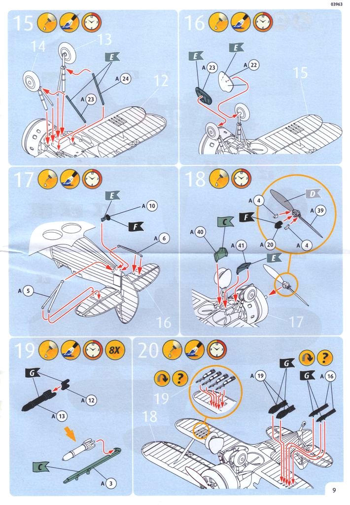 Ti kteří pamatují donedávna Revellem přibalované návody, budou asi trochu překvapení, ale naštěstí aspoň v tomto případě jsou kroky sestav čitelné a potěší i pár slov v češtině. V níže uvedených skenech je pár nepodstatných stran vynechaných.
