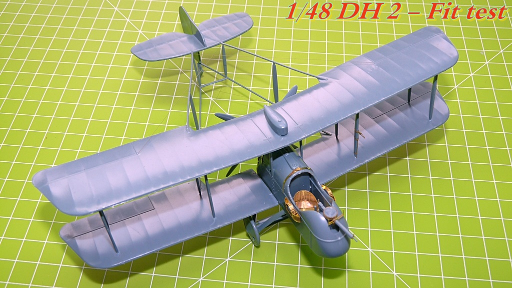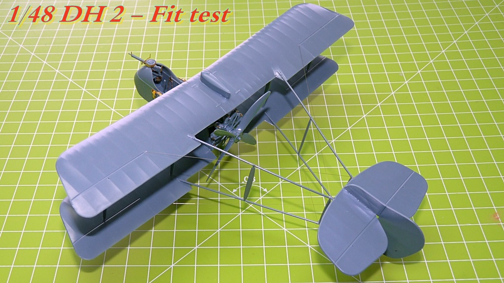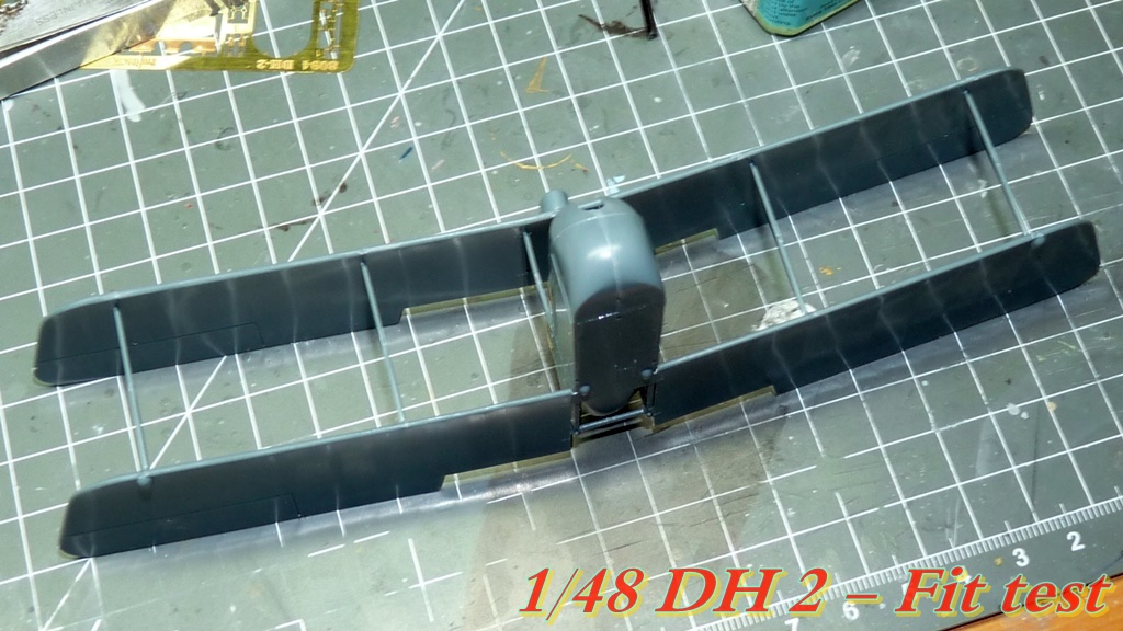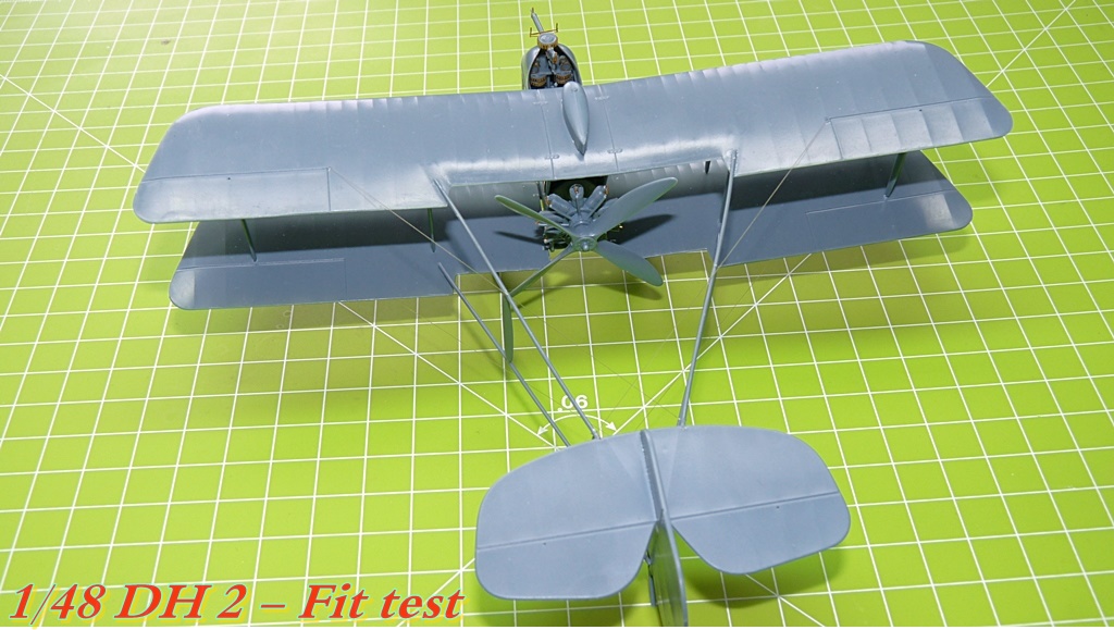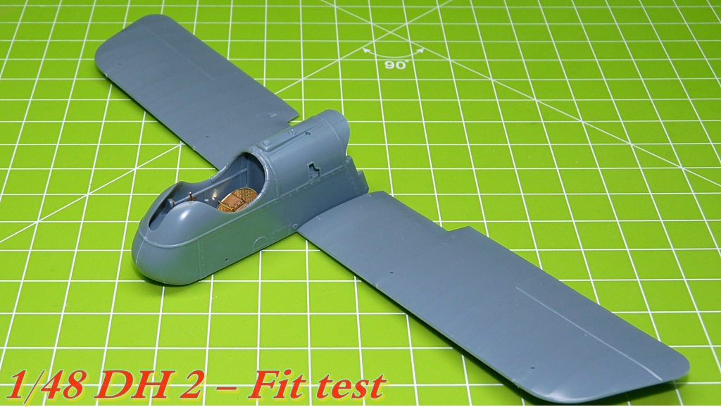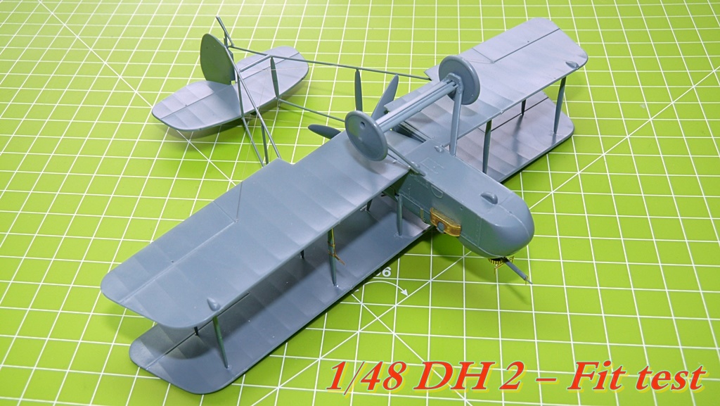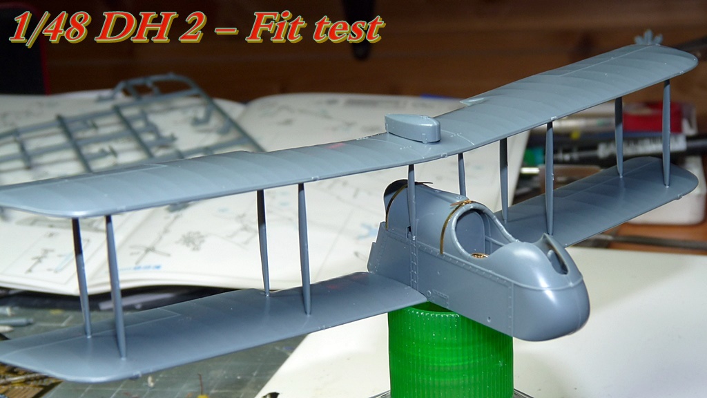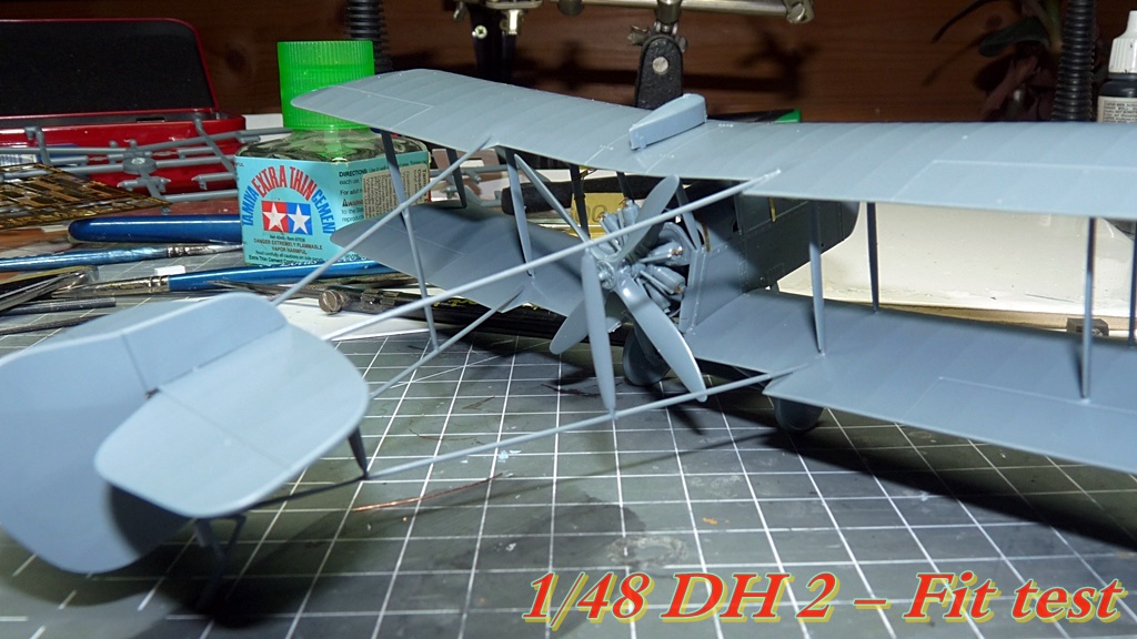 Díky absenci zadní části trupu a hornímu křídlu v zákrytu se spodním se dá křídlo přilepit bez použití stavebního stojánku (dokonce bych řekl, že to bez něho možná bude jednodušší) jen tak, že trup s křídly, na kterých jsou nalepeny přední vzpěry postavíme na "zadní" čumákem letounu nahoru, přiložíme horní křídlo, přilepíme jej a necháme proschnout. Poté opatrně nalepíme zadní vzpěry a voilà, je hotovo.