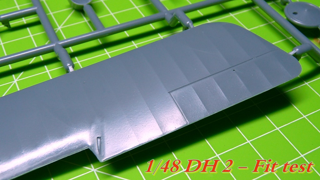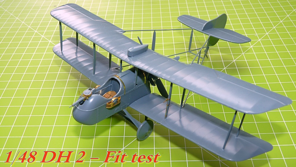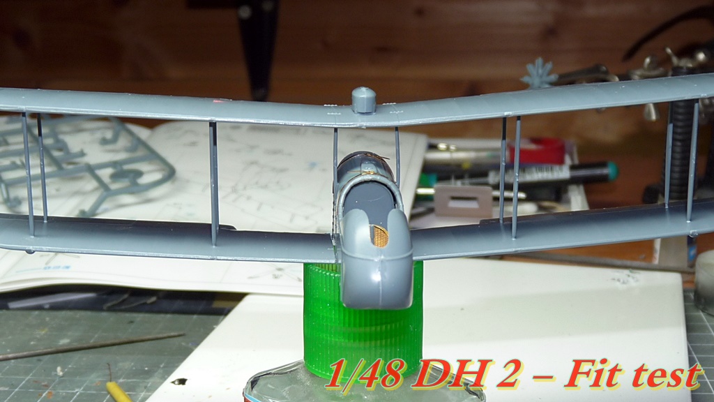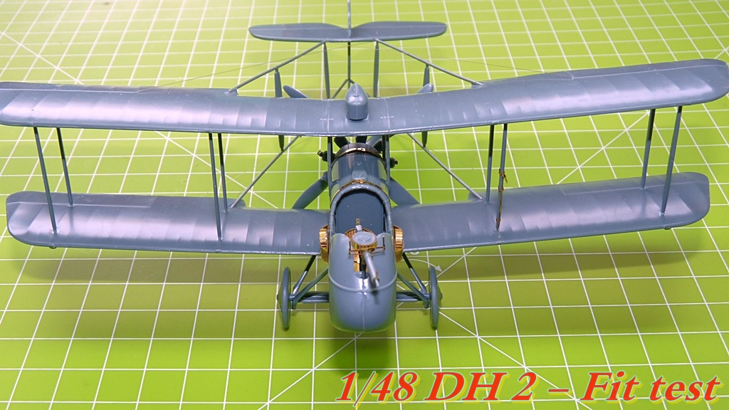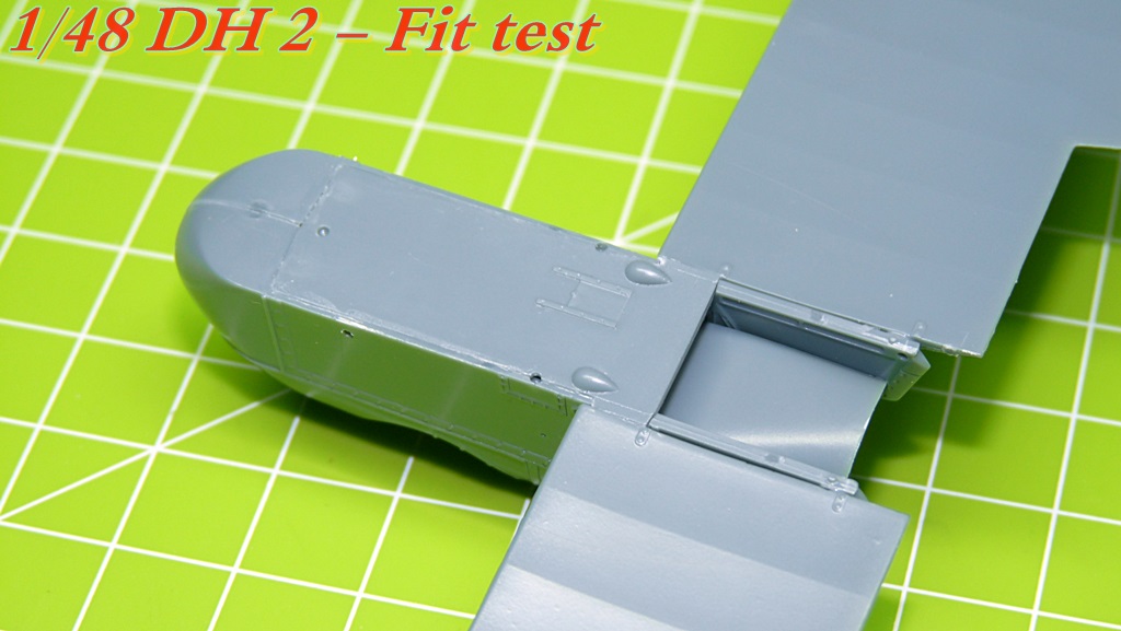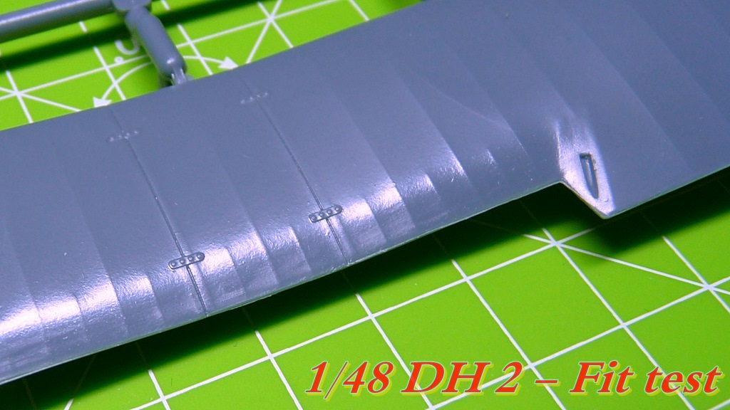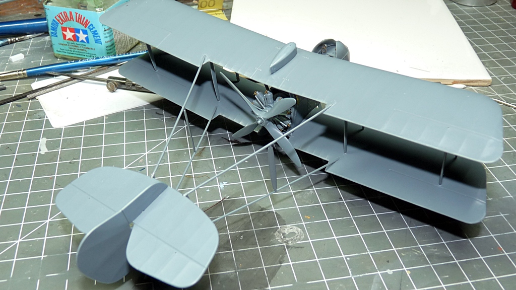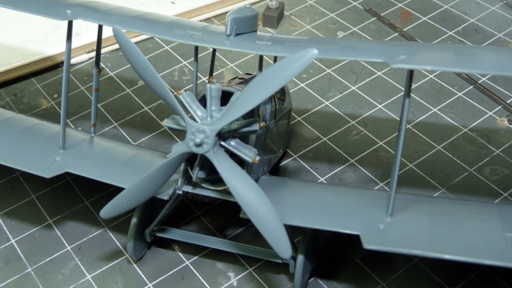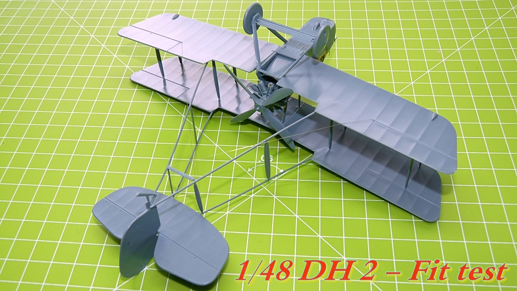 Díky absenci zadní části trupu a hornímu křídlu v zákrytu se spodním se dá křídlo přilepit bez použití stavebního stojánku (dokonce bych řekl, že to bez něho možná bude jednodušší) jen tak, že trup s křídly, na kterých jsou nalepeny přední vzpěry postavíme na "zadní" čumákem letounu nahoru, přiložíme horní křídlo, přilepíme jej a necháme proschnout. Poté opatrně nalepíme zadní vzpěry a voilà, je hotovo.