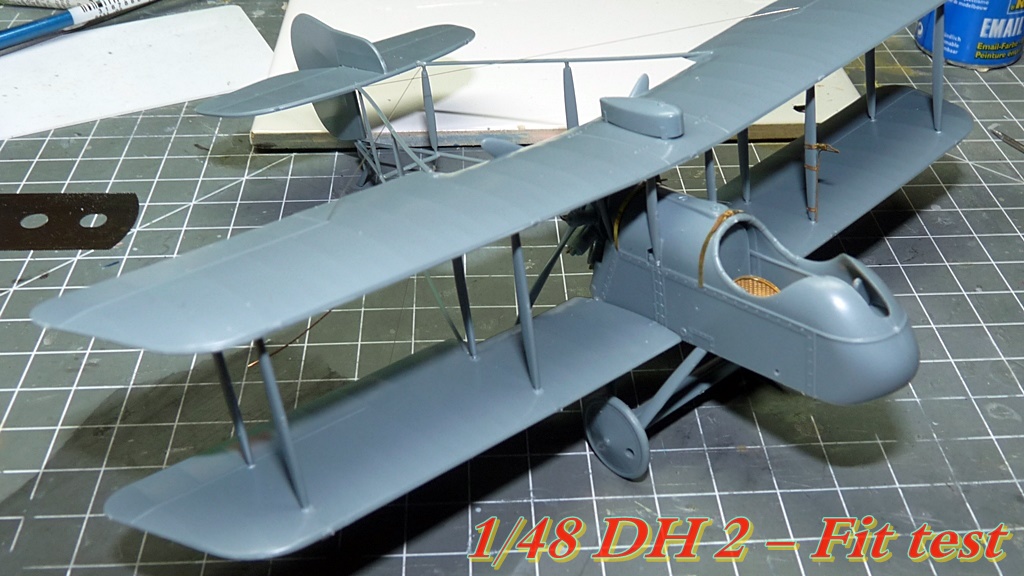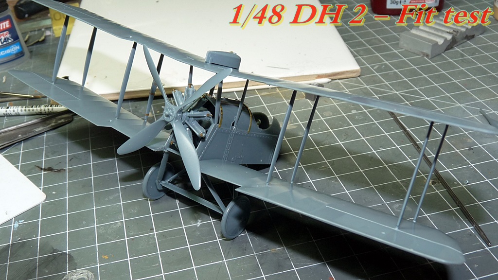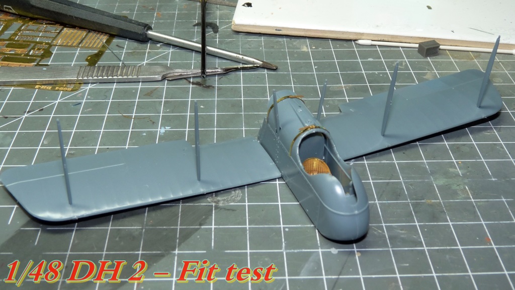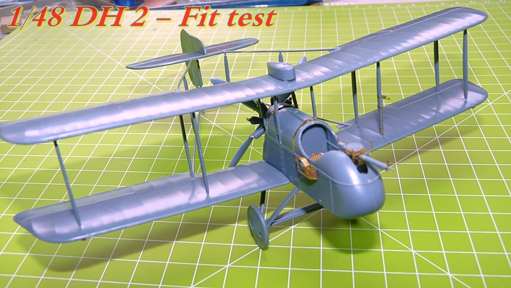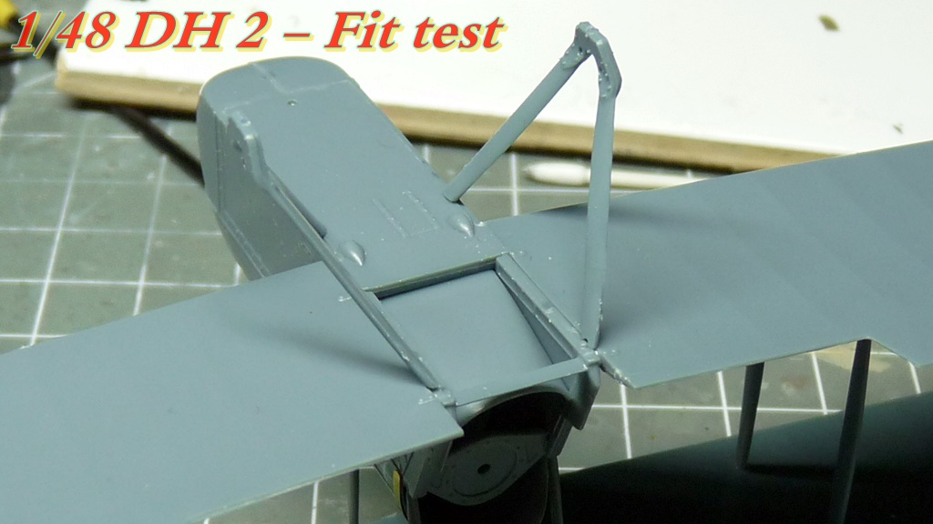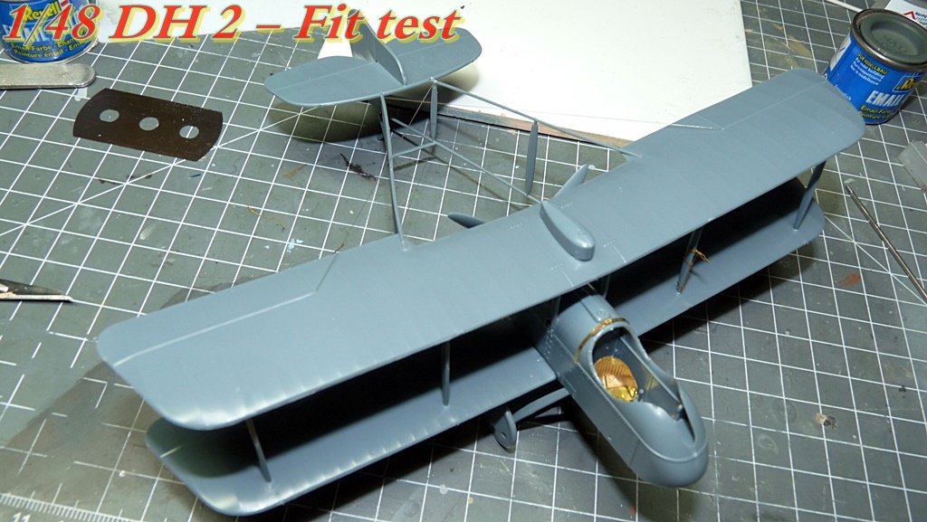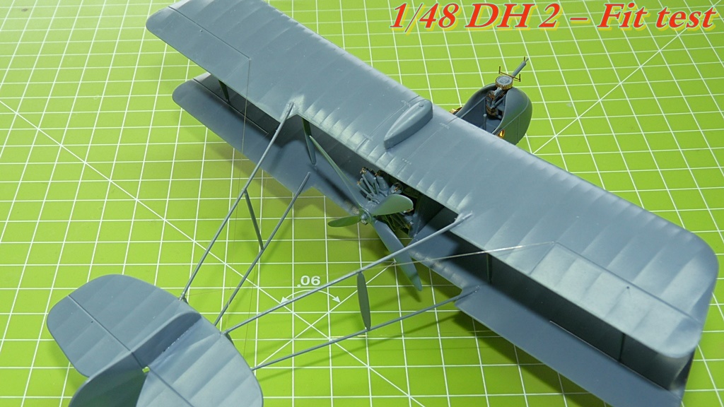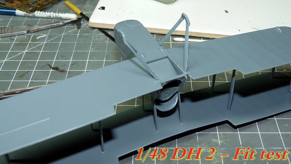 Díky absenci zadní části trupu a hornímu křídlu v zákrytu se spodním se dá křídlo přilepit bez použití stavebního stojánku (dokonce bych řekl, že to bez něho možná bude jednodušší) jen tak, že trup s křídly, na kterých jsou nalepeny přední vzpěry postavíme na "zadní" čumákem letounu nahoru, přiložíme horní křídlo, přilepíme jej a necháme proschnout. Poté opatrně nalepíme zadní vzpěry a voilà, je hotovo.
