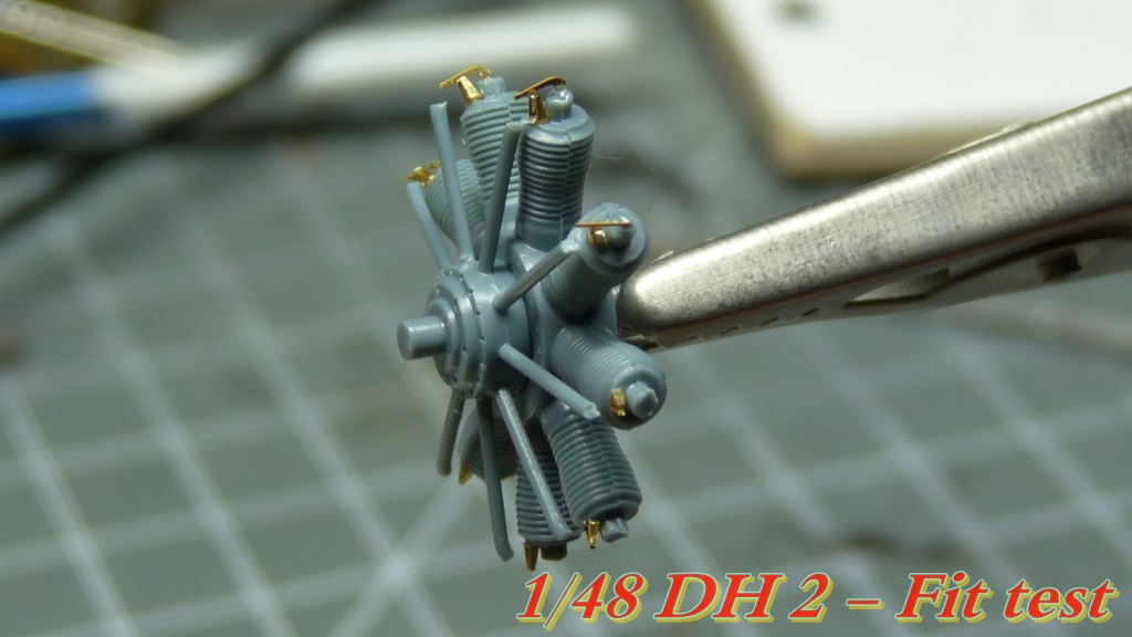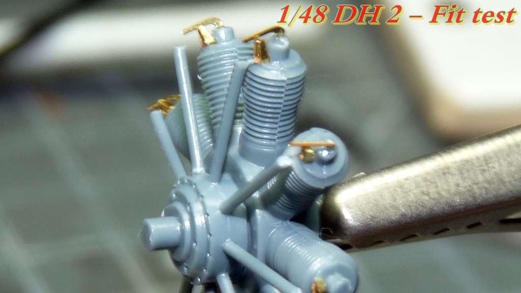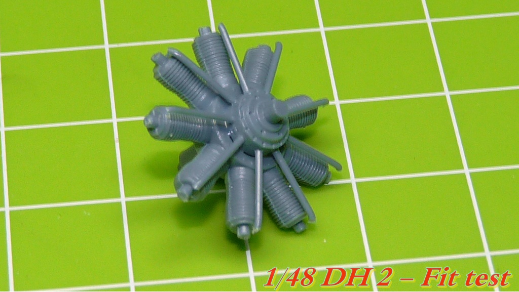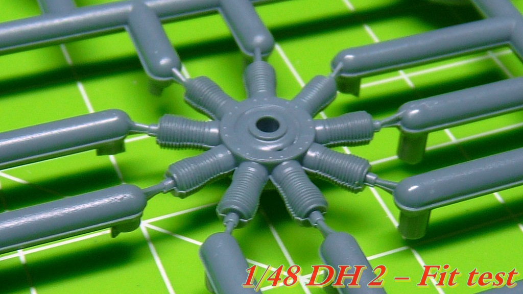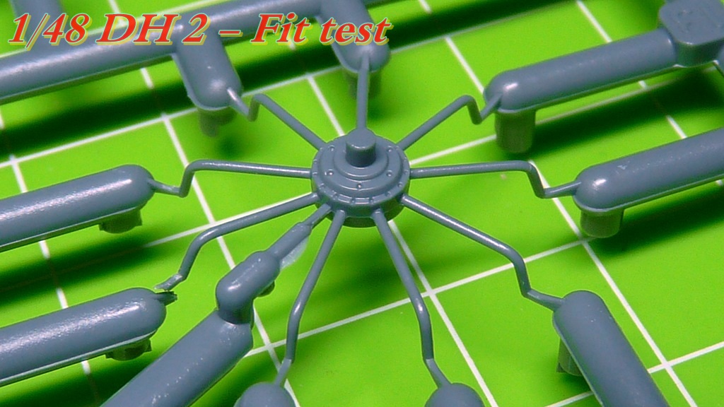 Následovalo slepení rotačního hvězdicového motoru. Jak jsem již psal, je na něm vidět přesazení dělící roviny formy. Motor má plastové tyčky k vahadlům ventilů, které jsou však příliš silné a tím pádem nemodelové a zaslouží si, v případě že v modelu použijeme původní motor, nahradit slabšími. Náhrada je potřeba ještě proto, že jsou kratší, než by bylo potřeba - pokud je odřízneme v místě, kde původně přecházejí do oblouku, nedosáhnou na leptaná vahadla ventilů.