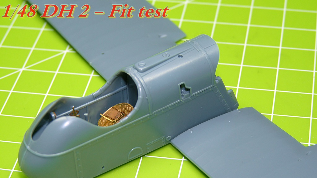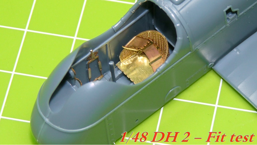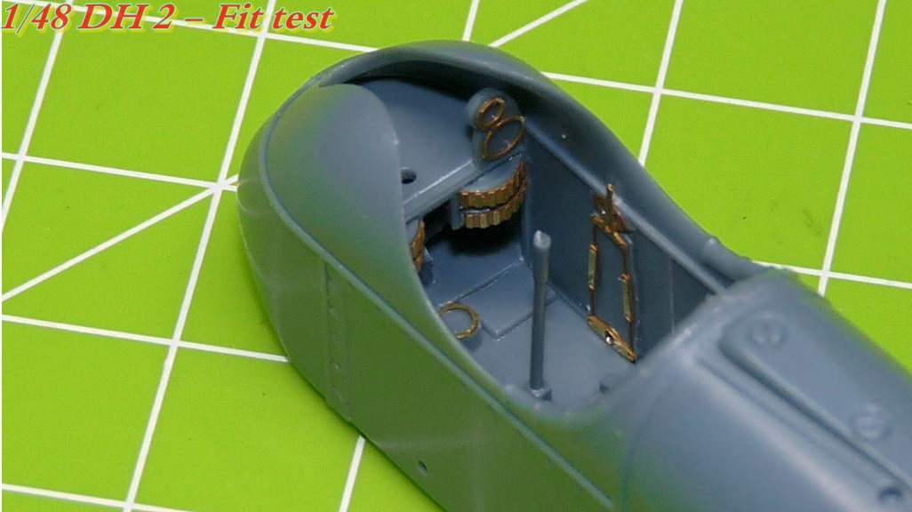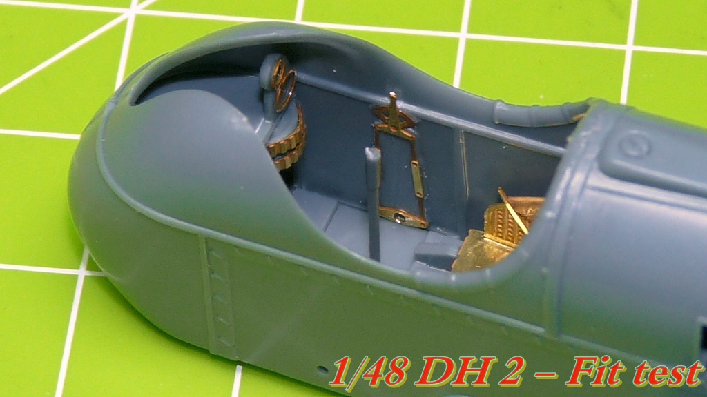 První jsem sestavil kokpit letounu. Ten je z části tvořen fotoleptanými díly (sedačka, rámečky přístrojů, ovládací prvky). Vše bez problémů pasovalo na své místo ve stavebnici, nebyly potřena žádné úpravy s výjimkou odstranění výlisků na vnitřní straně trupu a jejich nahrazení leptaným dílem.