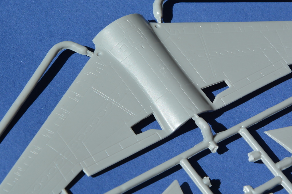 V rámečku D jsou díly potřebné pro podvozek, E obsahuje díly motorů a konečně rámeček F obsahuje drobné díly (antény, mechanizace klapek). U těchto rámečků nejsou díly postižené kazy jako u těch velkých. Rytí je místy trochu rozplizlé, ale to spraví jemné projetí žiletkovou pilkou.