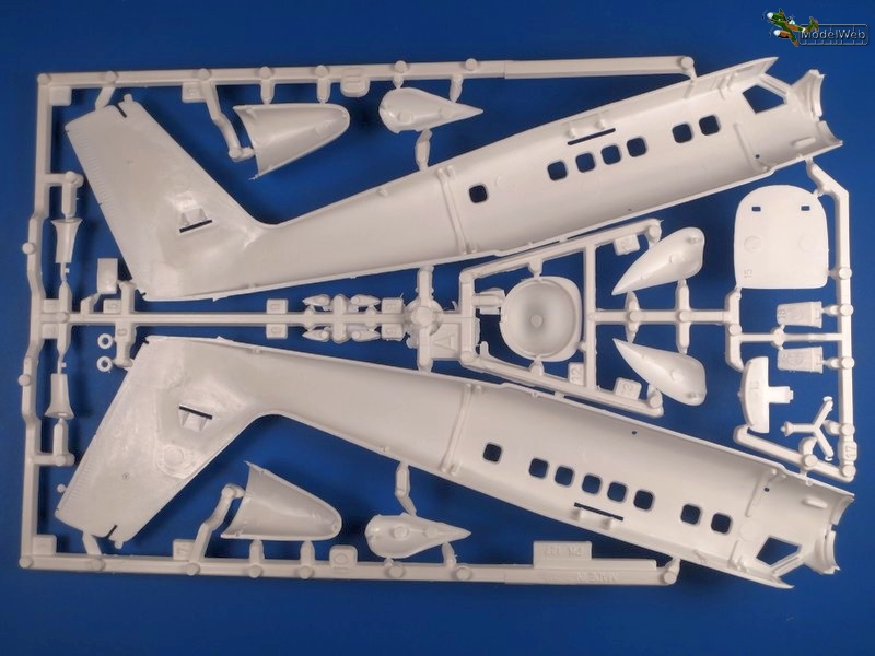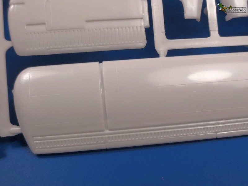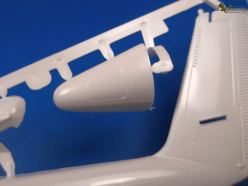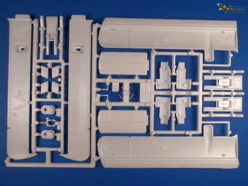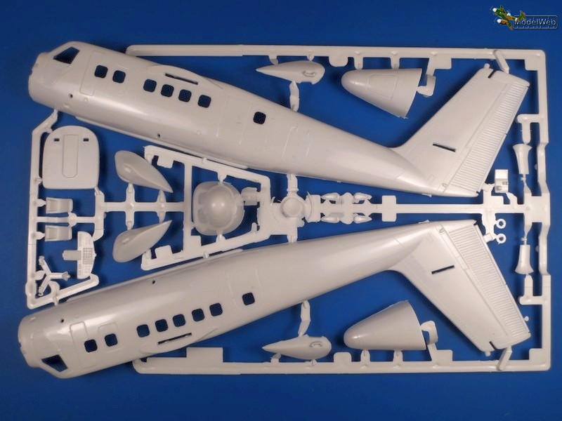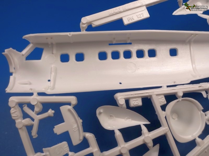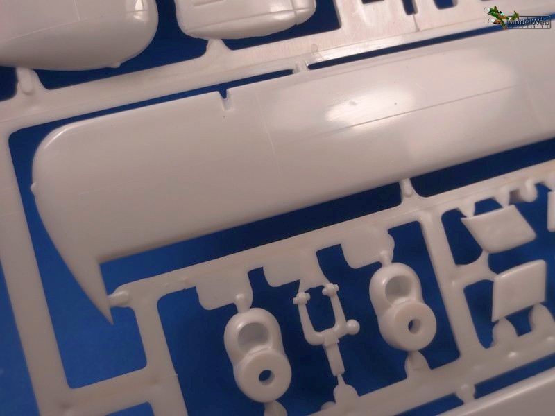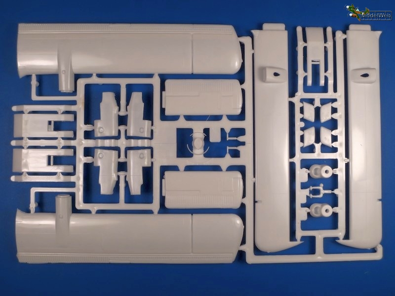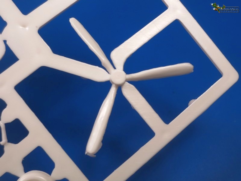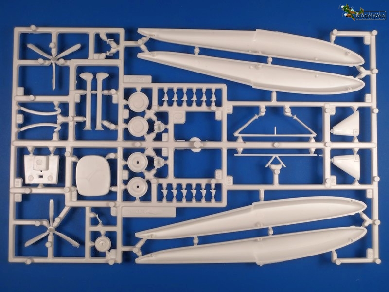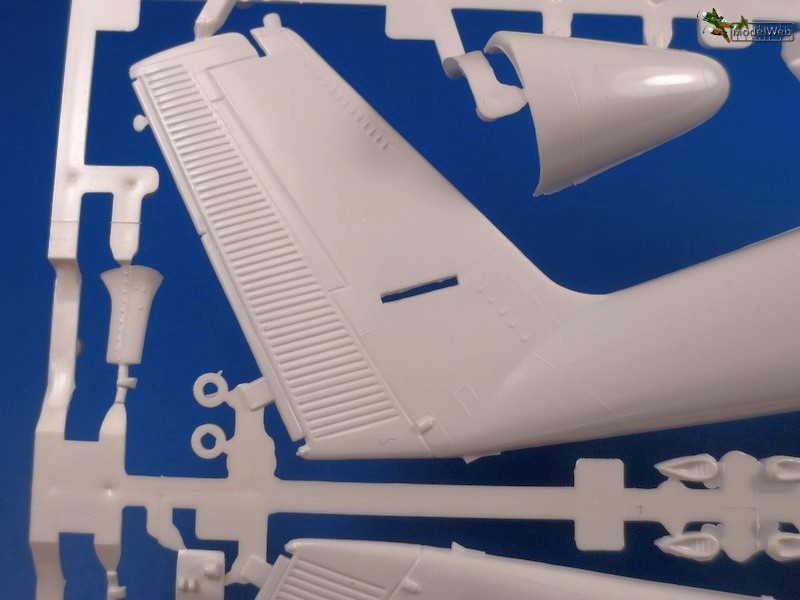 Přestože se jedná o poněkud starší model, výlisky nevykazují zásadnější chyby. Vidíme drobné otřepy, zvláště na menších dílech, třeba vrtule, ale to není neřešitelné. Naznačení paneláže však není moc výrazné a také ho není mnoho - výkres, fotky a přerytí asi nebude tak úplně od věci. Naopak jiné detaily, například směrovka, jsou velice povedené.