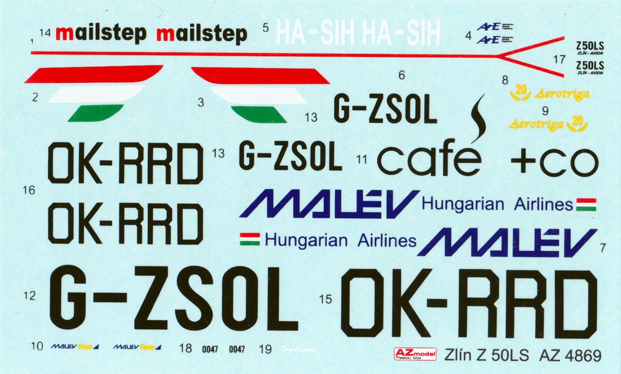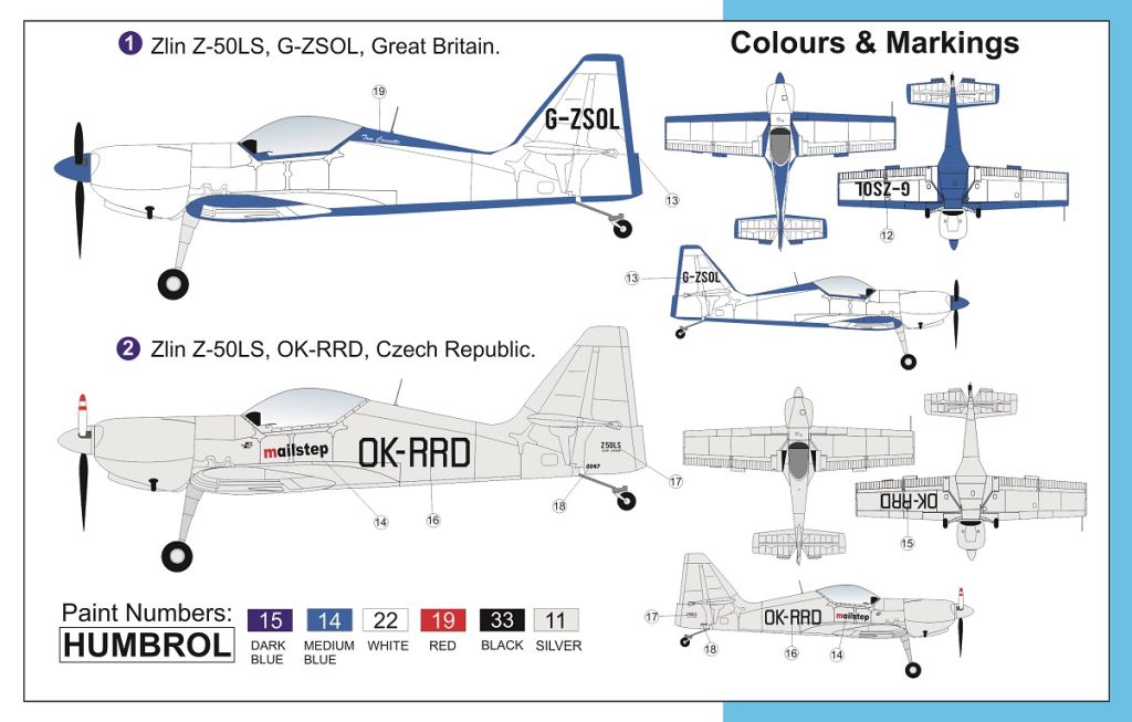 Ze stavebnice lze postavit jednu ze tří kamufláží. Malev Aerobatic team z Maďarska s označením HA-SIH nalezneme na přední straně krabice. Na zadní straně dále nalezneme stroj s označením G-ZSOL s Británie a stroj s označením OK-RRD z České republiky.