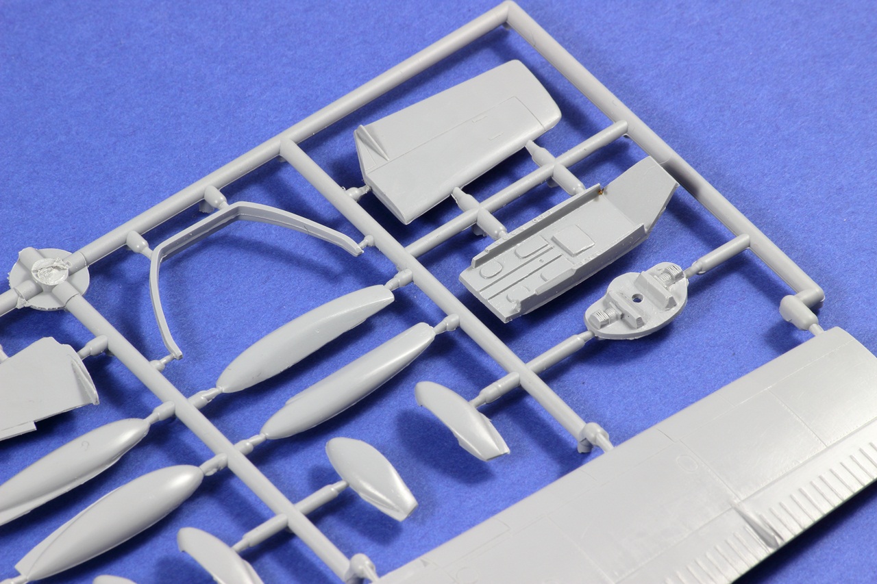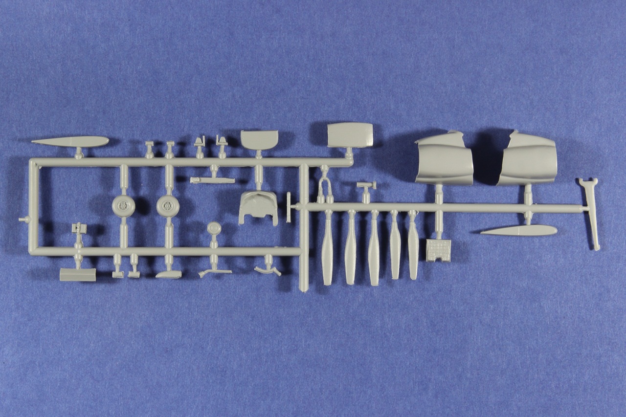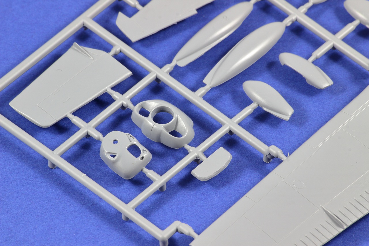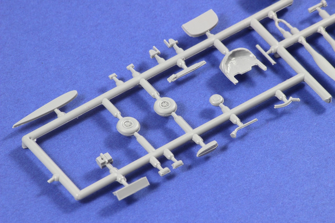Všechny rámečky jsou z šedého plastu. Díly mají místy snadno odstranitelné otřepy. Nejmenší rámeček má lehce posunutou dělící rovinu a bohužel se na tomto rámečku nachází kola. Ale jedná se pouze o cca 2 desetiny milimetru, tudíž s opravou nebude moc práce.