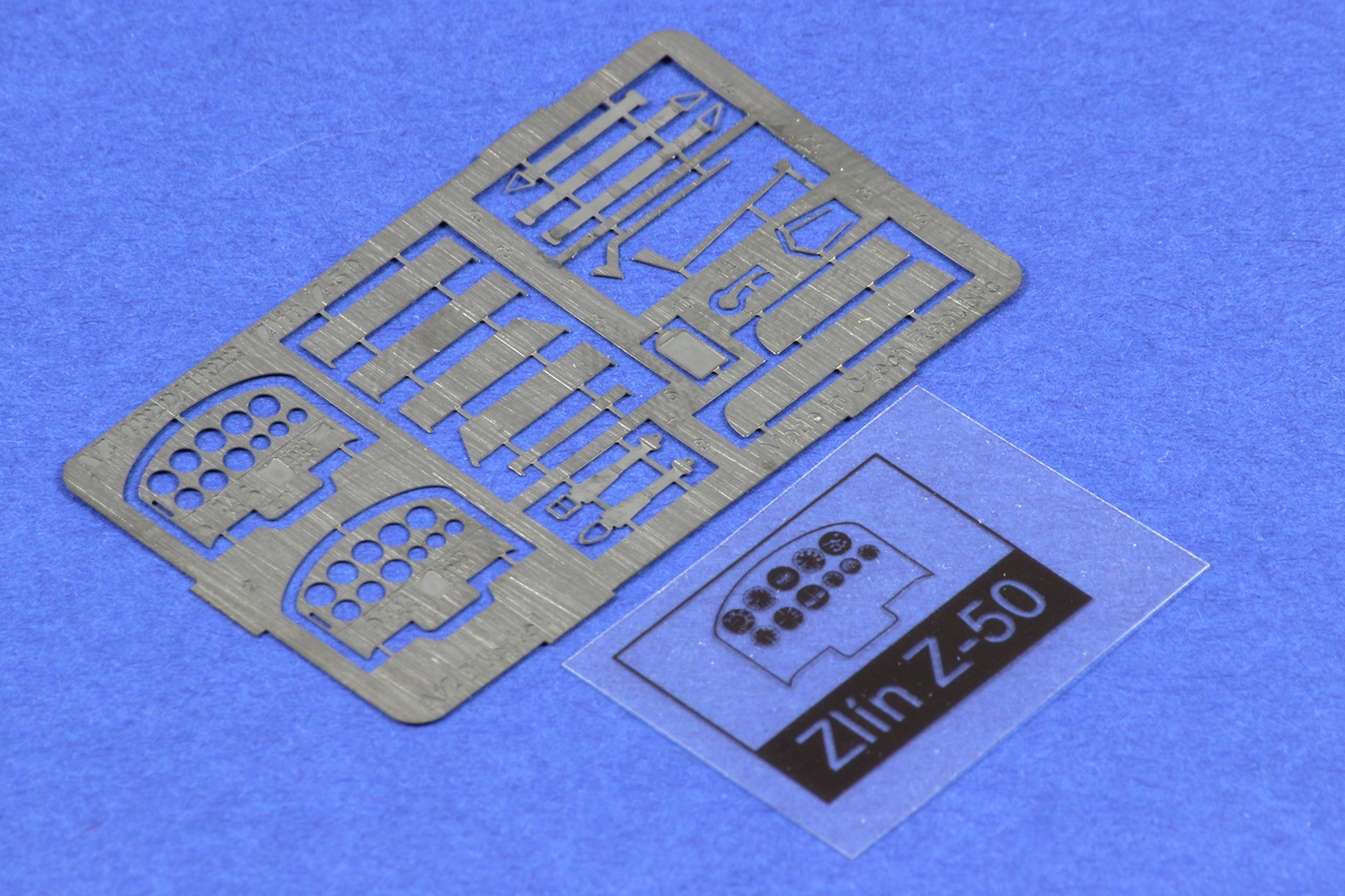 V modro-bílé krabici nalezneme jeden sáček, ve kterém se nachází 3 rámečky lisovaných dílů, jeden odlévaný díl, fólie přístrojové desky, vyleptané plechové díly, obtisky a návod.