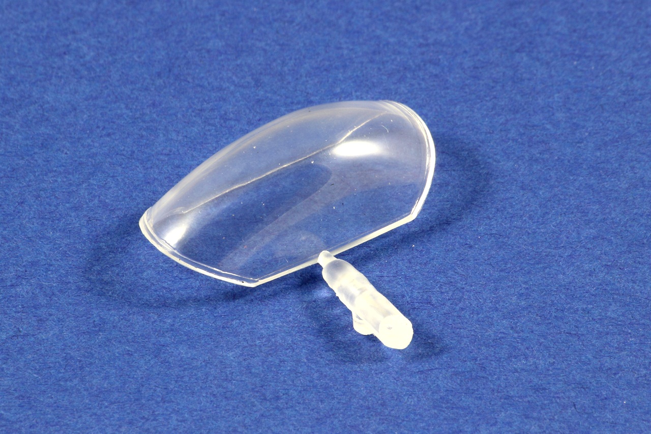 Čirý překryt kabiny je čistý, bez vad a otřepů. Vtok je v rámu a nezasahuje do skla.