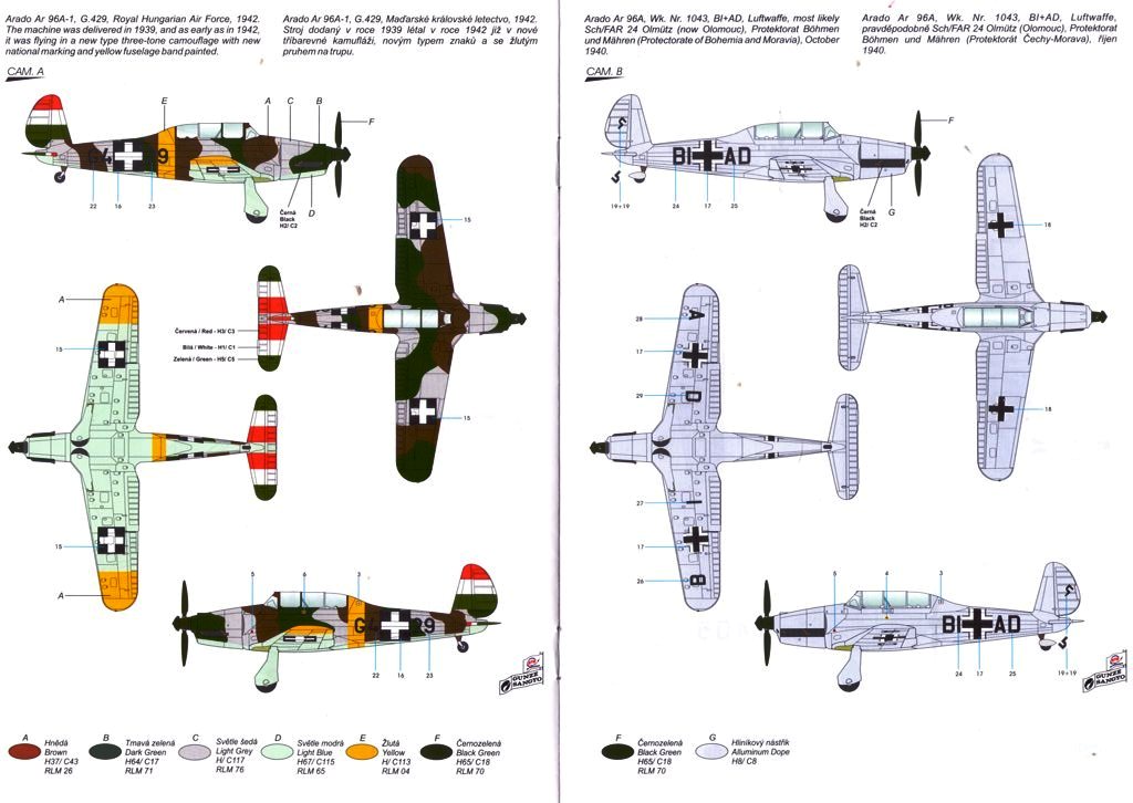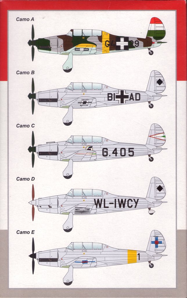 Vybírat můžeme mezi dvěma Maďarskými stroji, další dva stroje jsou Německého letectva, přičemž kamuflážní schéma D má představovat prototyp V-6 představující již sériové provedení verze A. Poslední z pětice schémat je stroj s markingem SVZ. Kromě kamuflážního schematu A kde je stroj maďarského letectva v tříbarevné kamufláži jsou zbývající stroje jen v hliníkovém nástřiku.