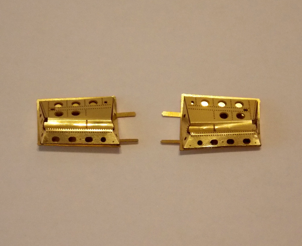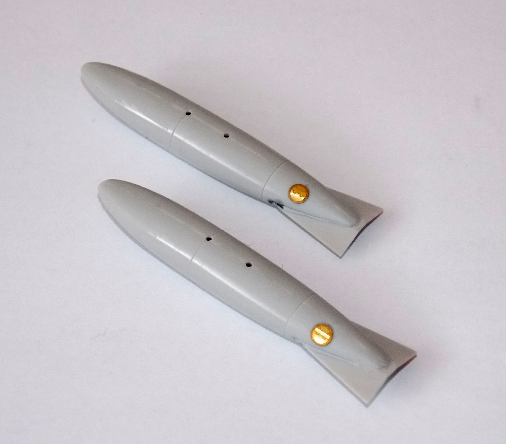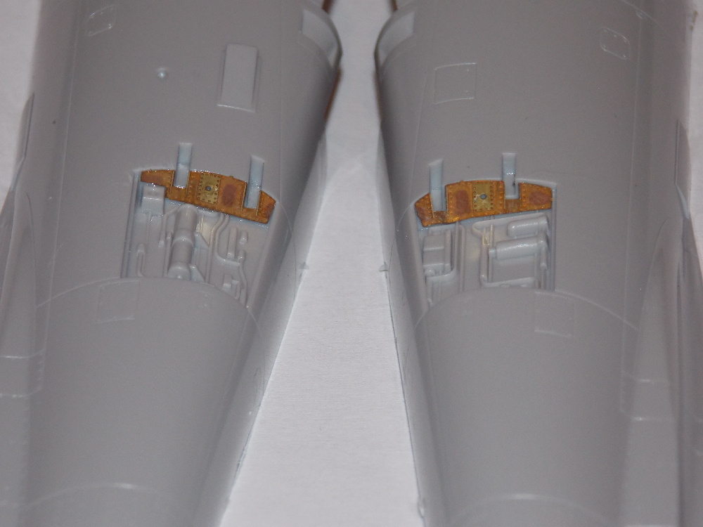 Přídavné nádrže jsem slepil dohromady, spoje přetřel surfacerem, přebrousil a nalepil víka z leptu. Aerodynamické brzdy z leptané sady jsem vytvaroval podle plastových, doplnil další drobné díly a nabarvil společně s nádržemi.