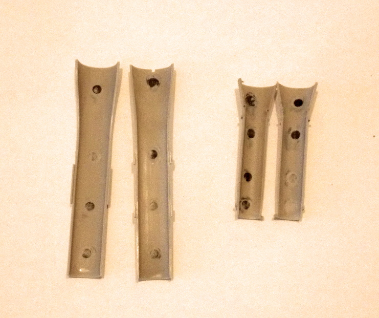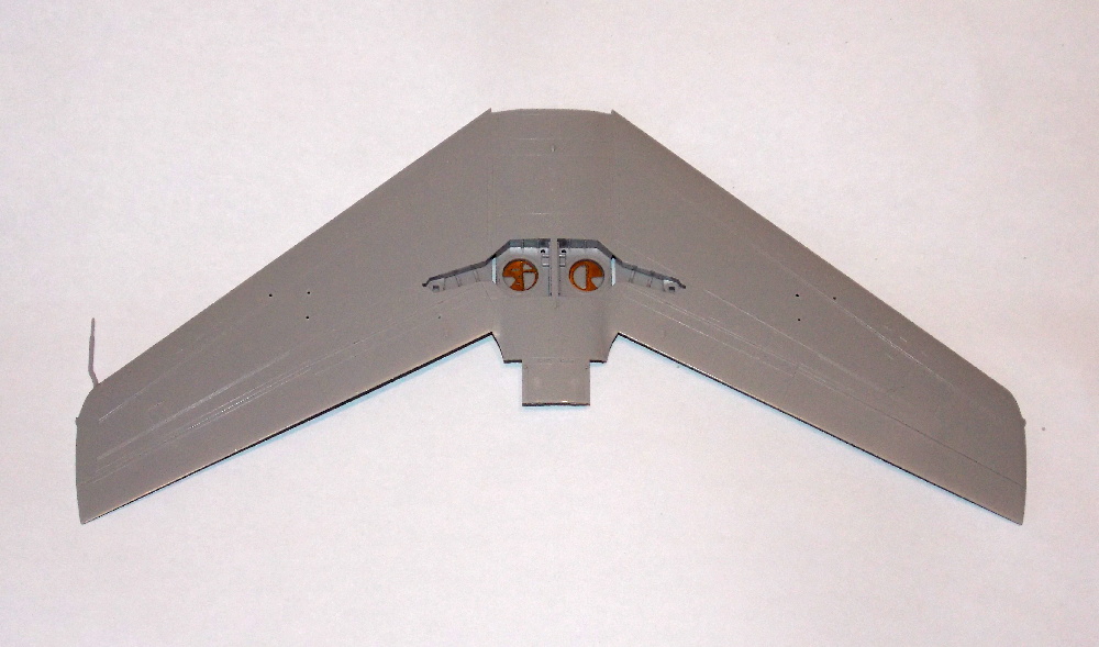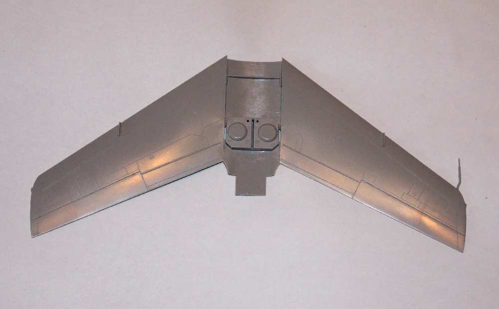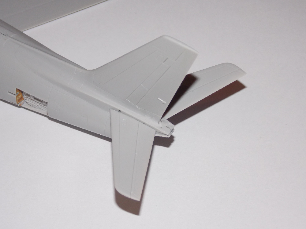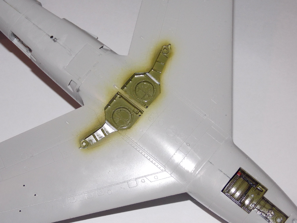Díly křídel jsem vyjmul z rámečku, začistil a slepil k sobě, spoje po vyschnutí lepidla začistil. Následně jsem nalepil aerodynamické plůtky a pitotovu trubici. Do podvozkových šachet hlavního podvozku jsem doplnil nebarevné díly z leptané sady. Na spodní části polovin křídla jsem nalepil závěsníky pro přídavné nádrže.