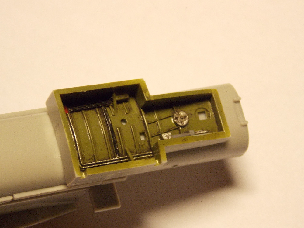 Před sestavením trupu bylo třeba sestavit sání k motoru a výtokovou trysku. Na těchto dílech bylo několik stop po vyrážečích, které jsem zatmelil a vybrousil. Poté jsem sestavy nabarvil a napustil washem. Na přední část sání jsem nalepil přední podvozkovou šachtu, do které jsem nalepil leptané díly a šachtu následně nabarvil a napatinoval. Dále jsem na sestavu sání nalepil vanu kabiny a celek vlepil do poloviny trupu společně s výtokovou tryskou.