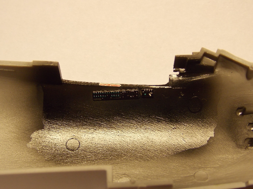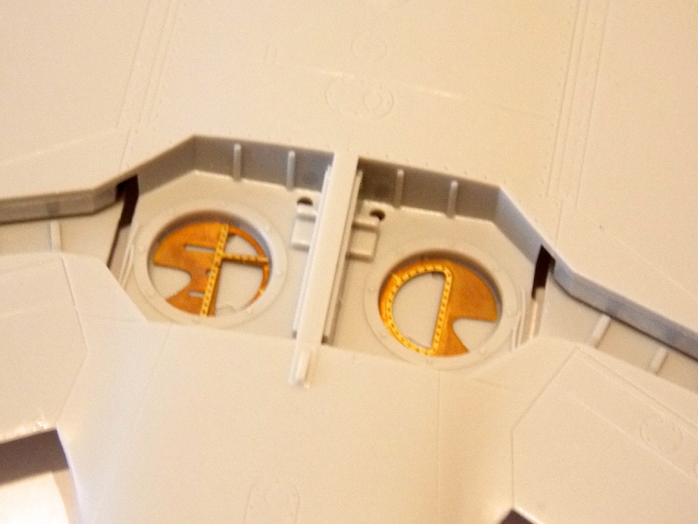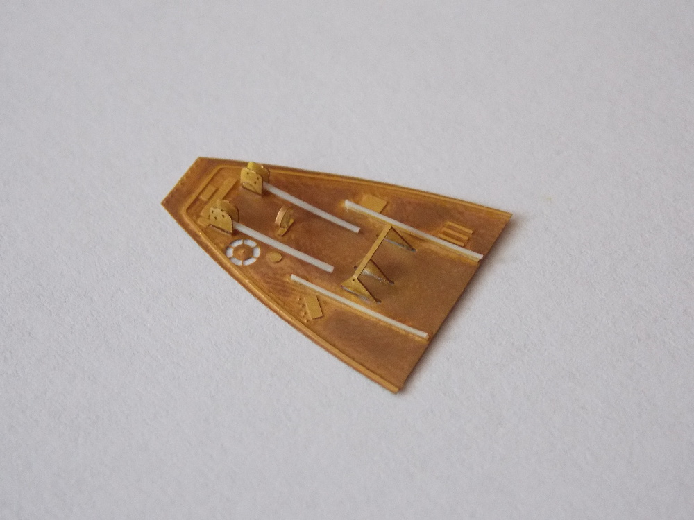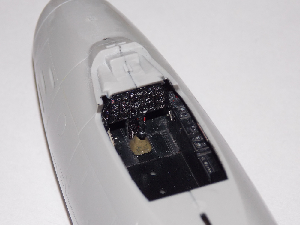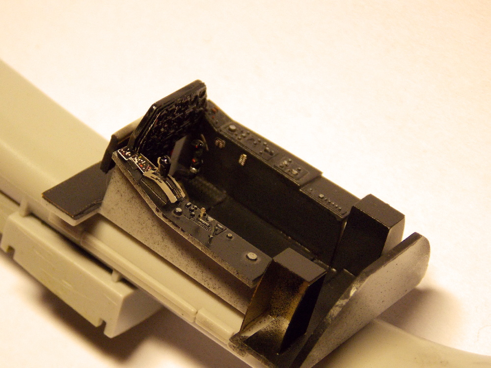 Stavbu modelu jsem zahájil nalepením nebarevných leptaných dílů vany kabiny šachet aerodynamických brzd, kniplu řízení, zadní části kabiny pod odsuvným překrytem, leptané díly pedálu nožního řízení na plastový díl a to pak na palubní desku.