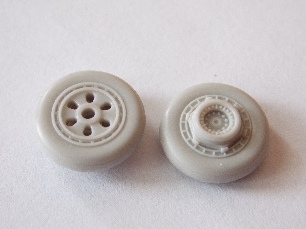 Podvozkové nohy jsem vyjmul z rámečku, začistil, nalepil leptané díly. Kola hlavního podvozku se skládají ze dvou dílů. Ty jsem slepil k sobě a spoje začistil. Kolo příďového podvozku je z jednoho dílu. Přední podvozkovou nohu jsem také jen začistil a doplnil lepty. Poté jsem podvozek nabarvil a napatinoval.