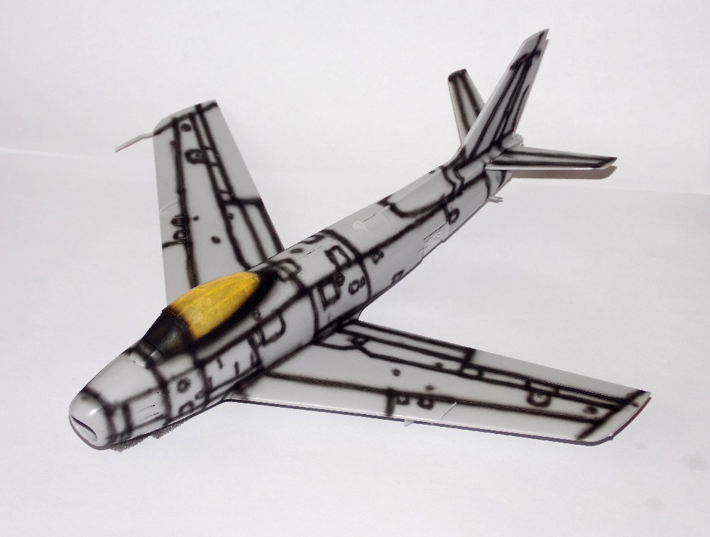 Na čiré díly kabiny jsem nanesl stříkací masky a tím měl připraveno na barvení. Nevím proč, ale celý model jsem opatřil preshadingem. Pak jsem model nabarvil barvama Alclad. Po jejich vyschnutí jsem celý model přetřel sidoluxem na PVC.
