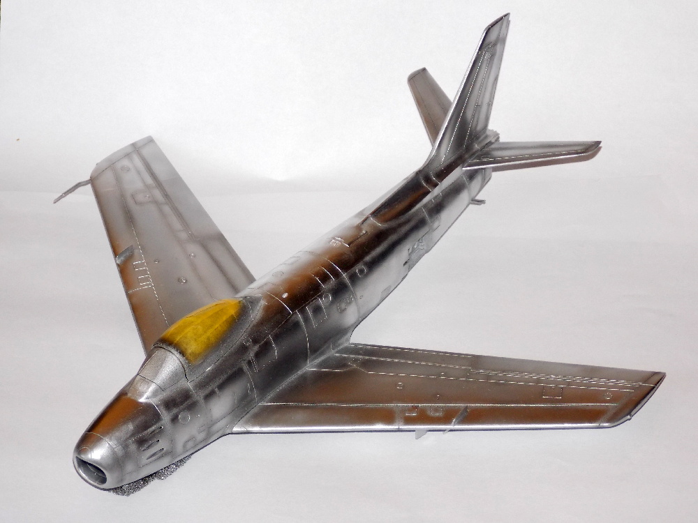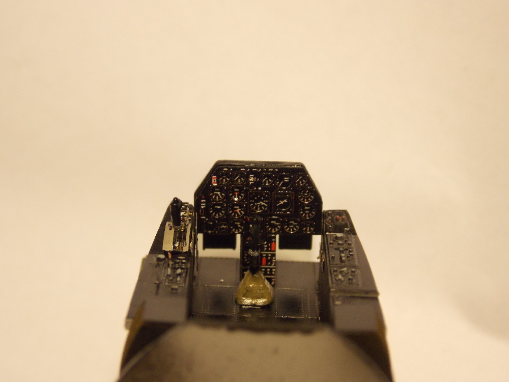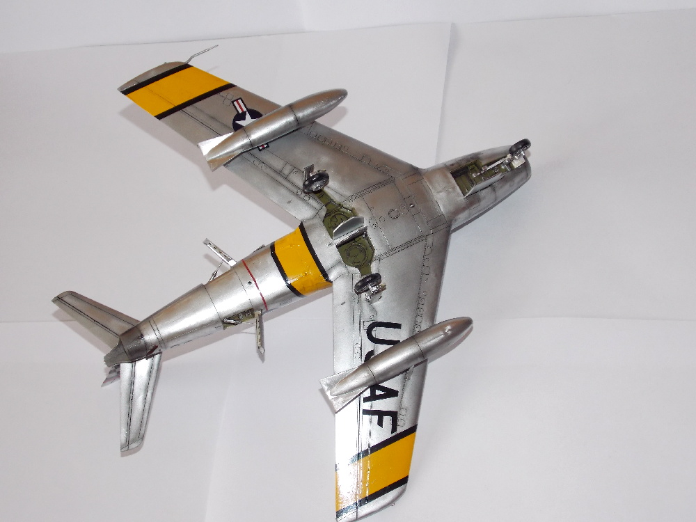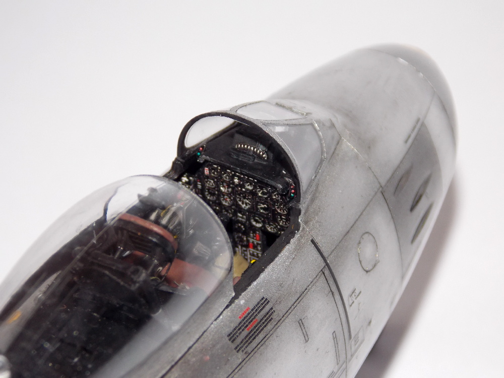 Model jsem opět přetřel sidoluxem a napustil spáry paneláže olejovou barvou. Po vyschnutí olejové barvy jsem celý povrch znovu přetřel sidoluxem, nalepil kryty podvozku, aerodynamické brzdy, přídavné nádrže, skla reflektorů a překryt kabiny, do kterého jsem jako poslední vlepil zpětné zrcátko a madlo. To jsem ale po chvilce odlomil, protože na fotce je vidět na pravé straně.