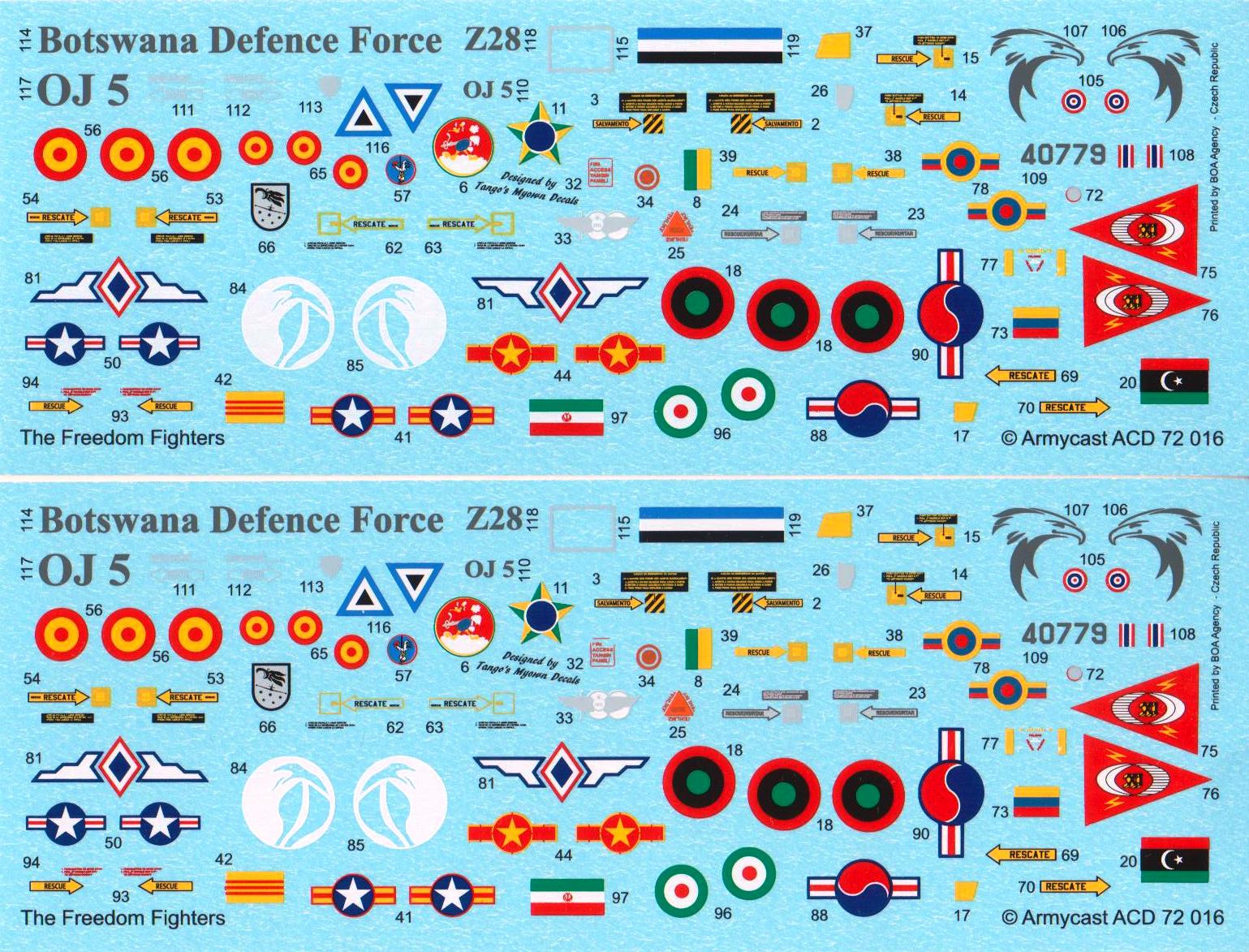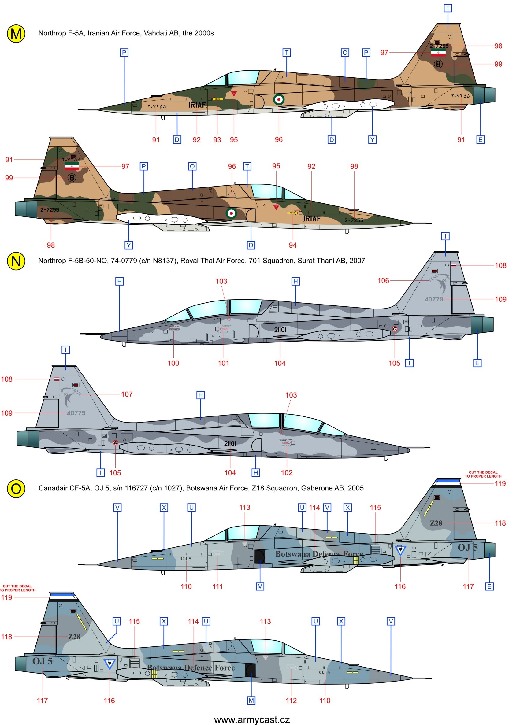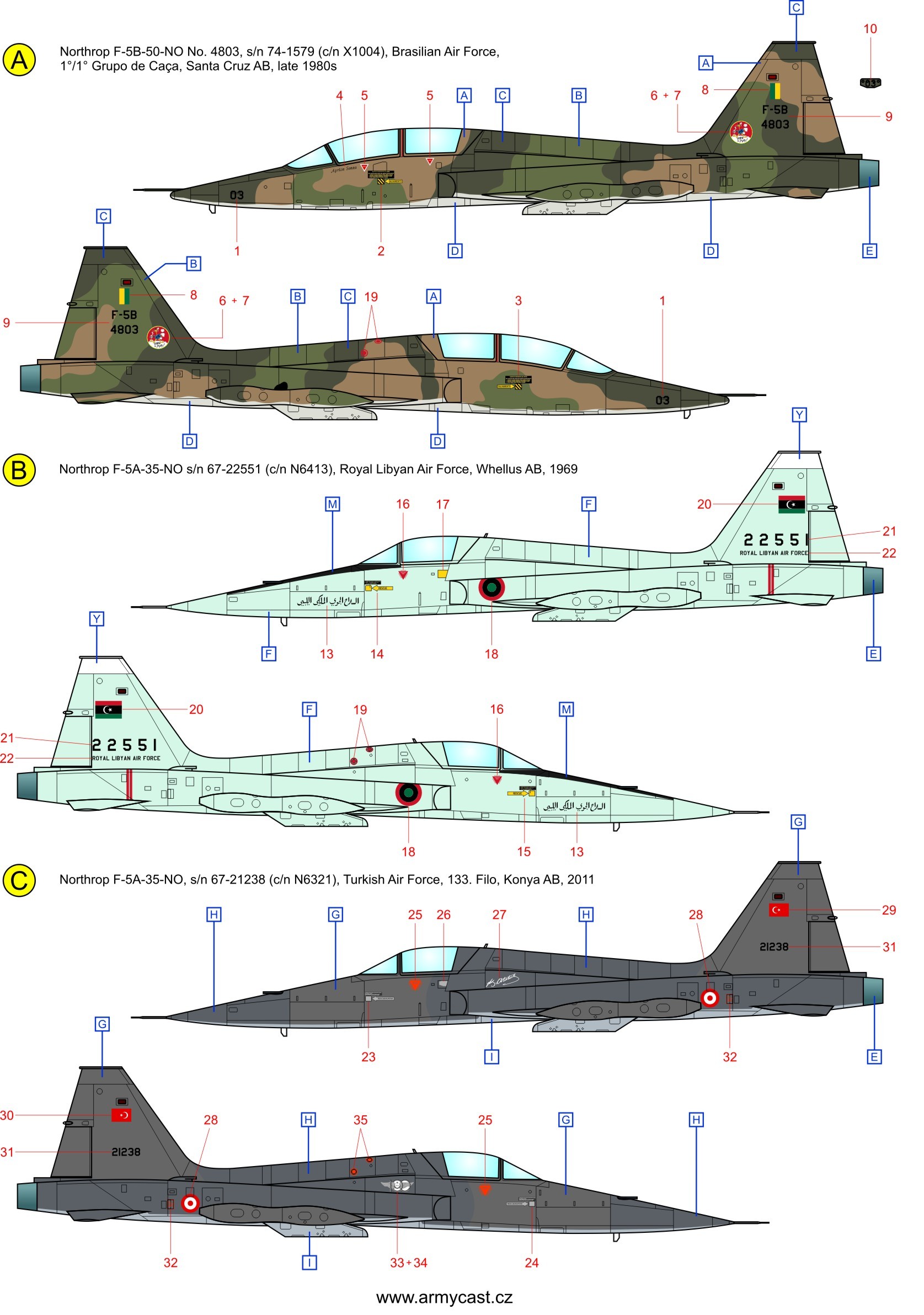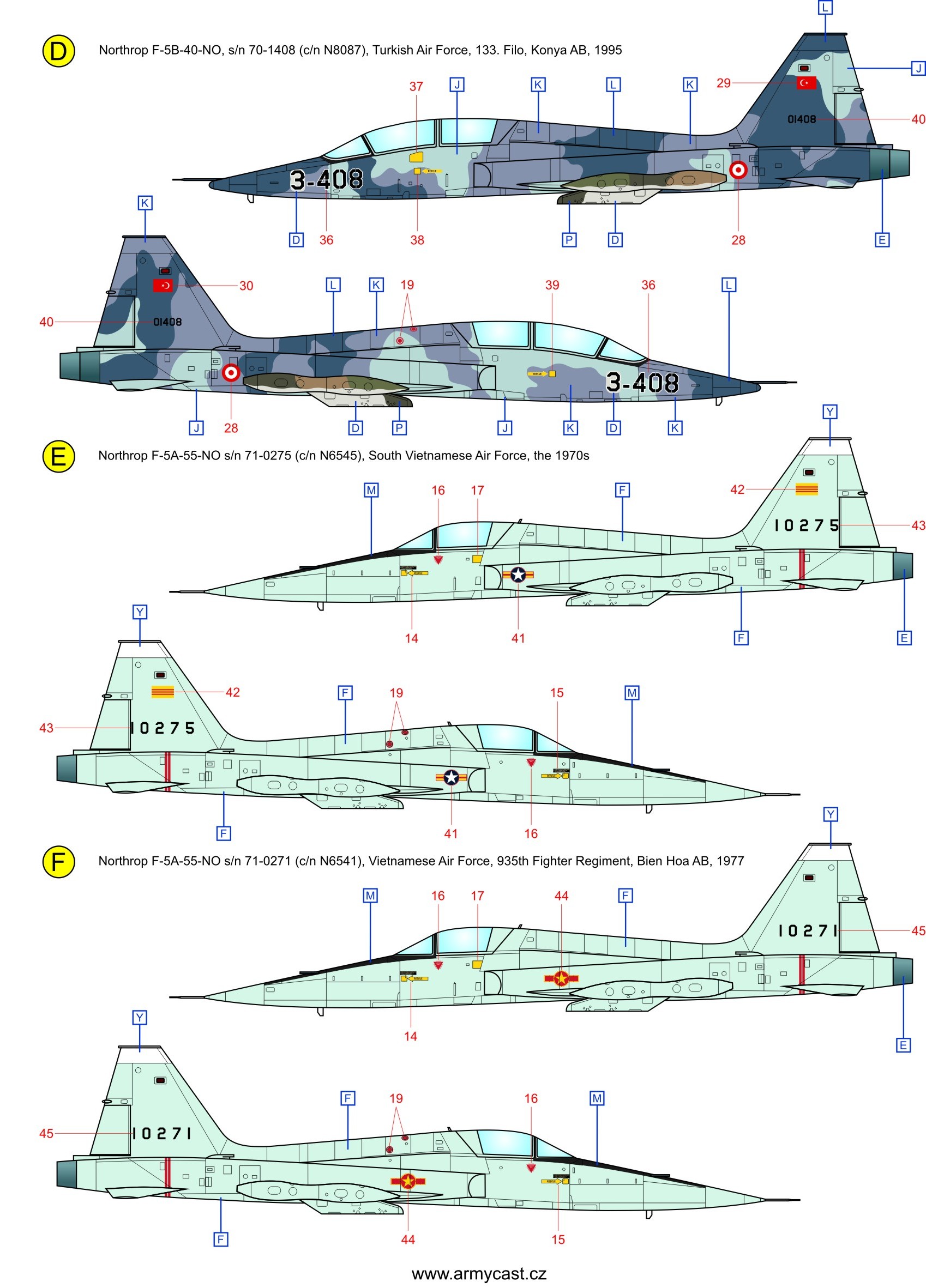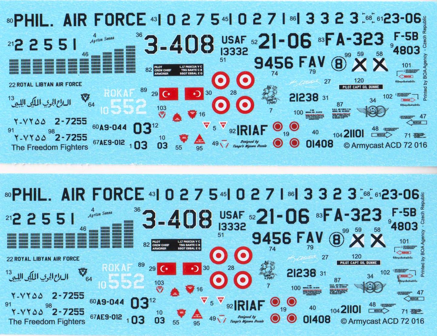 Obtisky jsou doporučeny pro modely firem ESCI a Italeri, ostatně jiné F-5A/B v tomto měřítku ani nejsou dnes dostupné. Ti, kteří mají rádi netradiční letectva, nad aršíkem zajisté radostí zaplesají a lze jim tuto sadu jen a jen doporučit.