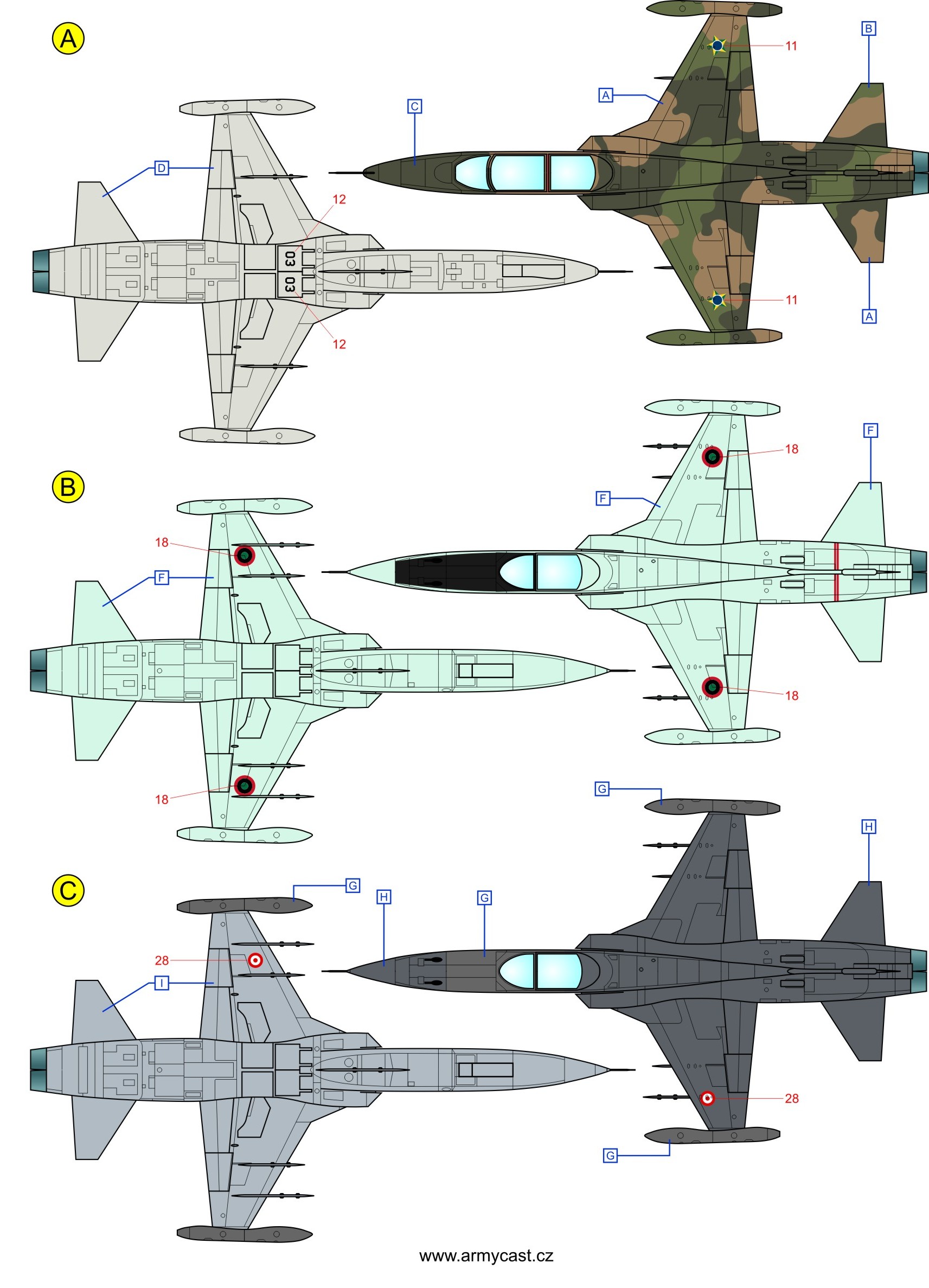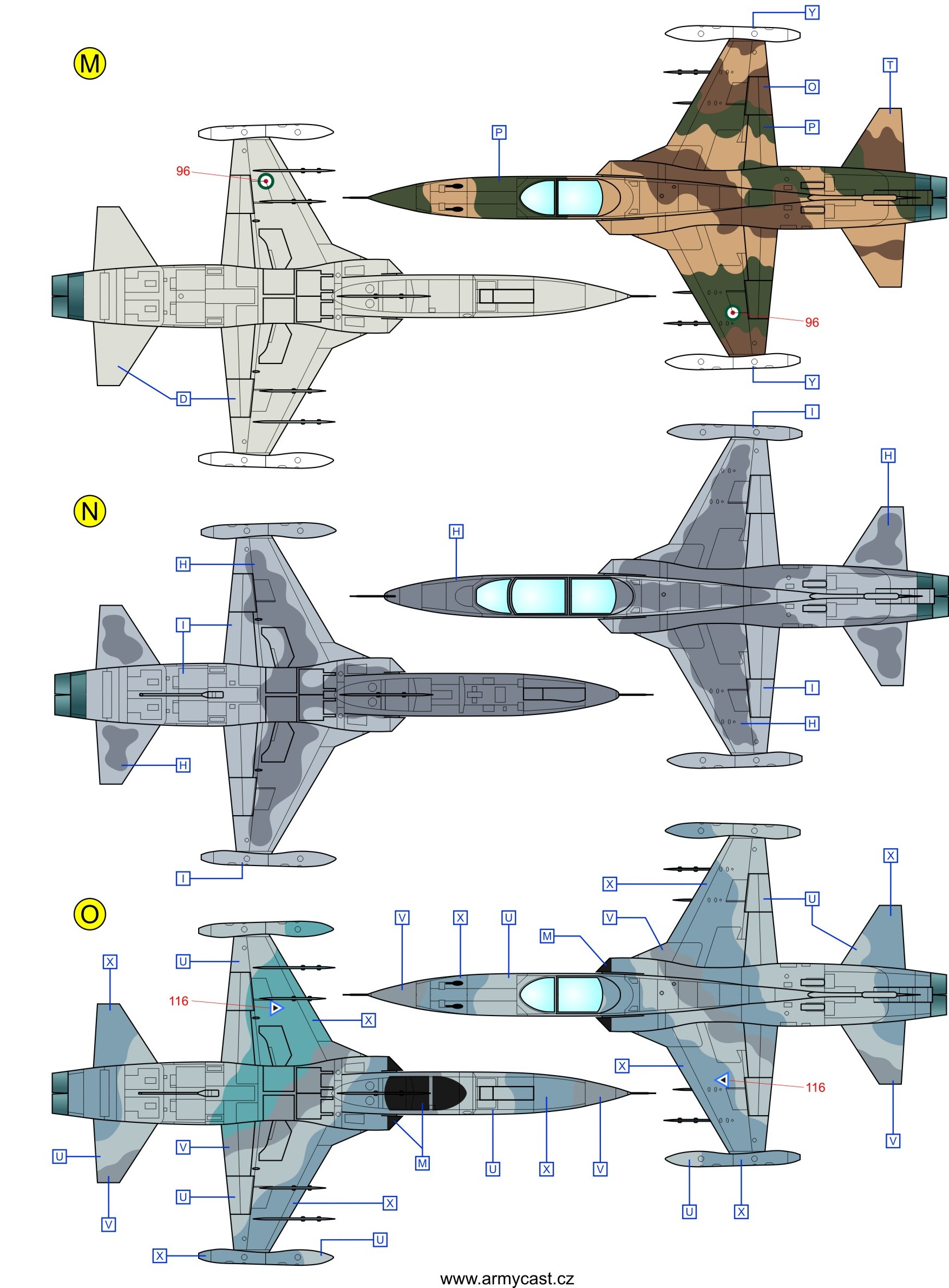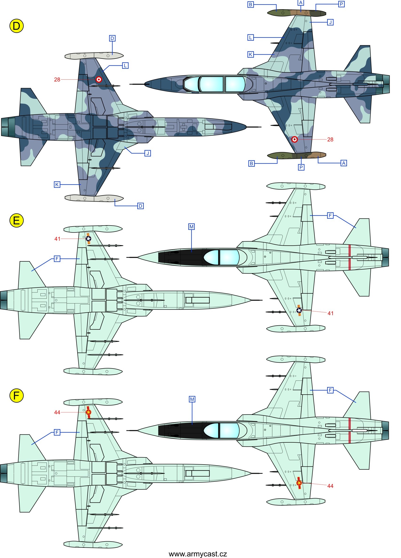 Kamuflované jednomístné letouny jsou nabídnuty v barvách letectev Turecka, USAF z nasazení ve vietnamské válce, Španělska, Venezuely, Jižní Koreje, Iránu a opravdu exotické Botswany. Dvoumístné letouny pak jsou k dispozici pro stroje Brazílie, opět Turecka a Španělska a nakonec Thajska.