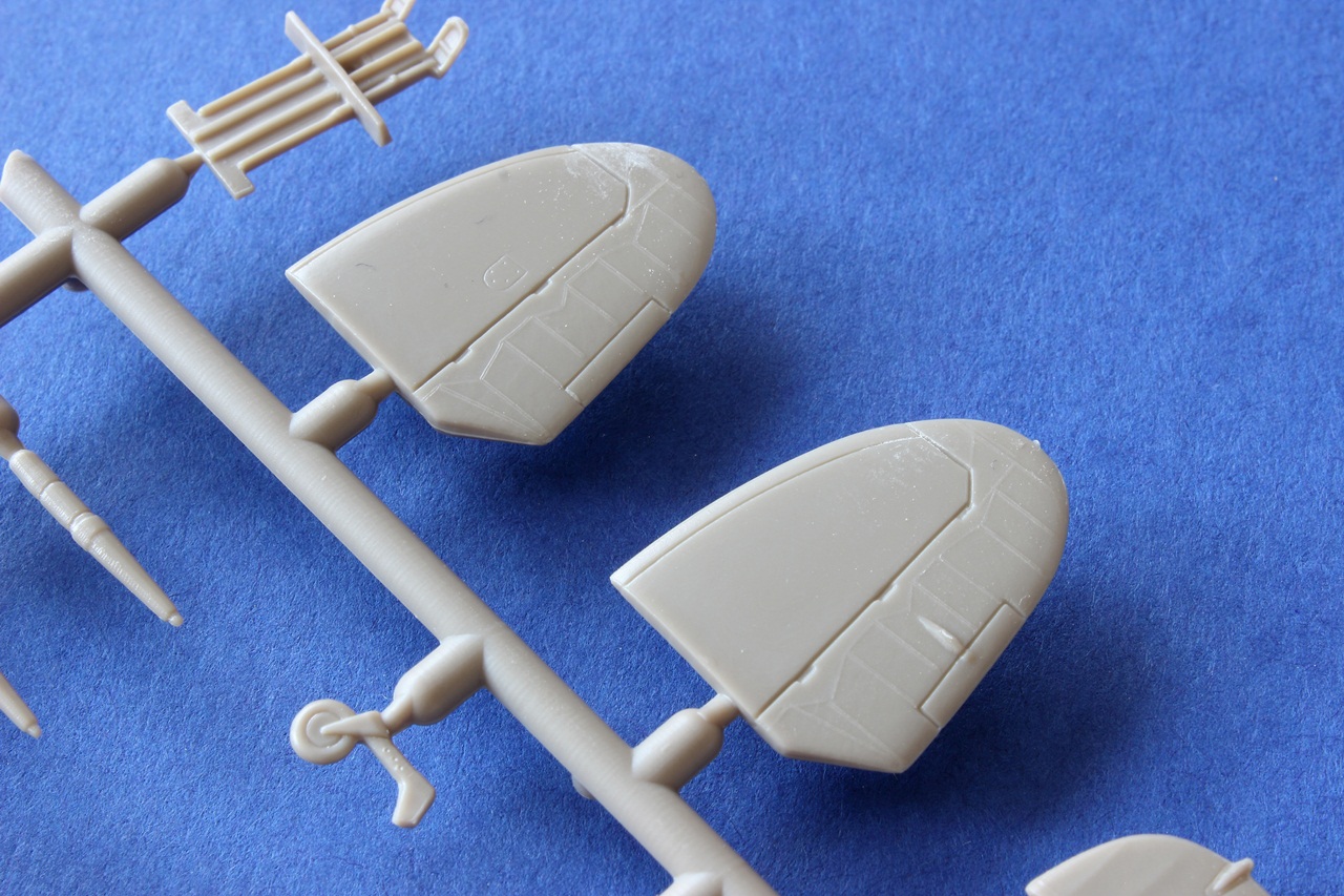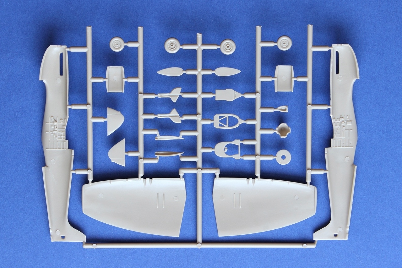 Stavebnice obsahuje známé rámečky Spitfira Mk.IX od firmy AZ Model. Díly jsou hladké, čisté, bez kazů a propadlin. Tenké a hluboké rytí se neztrácí. Překryt kabiny by si zasloužil vyleštění.