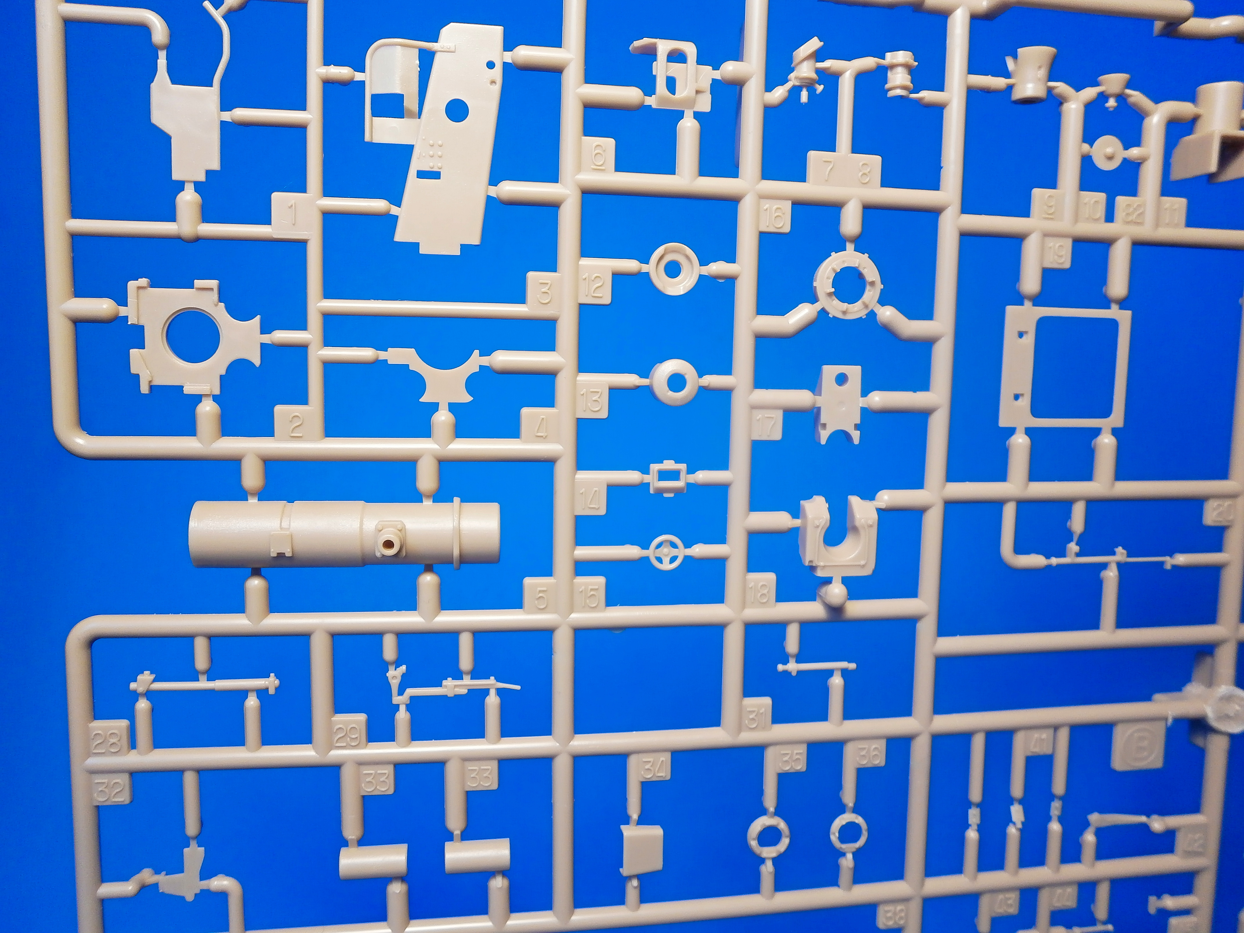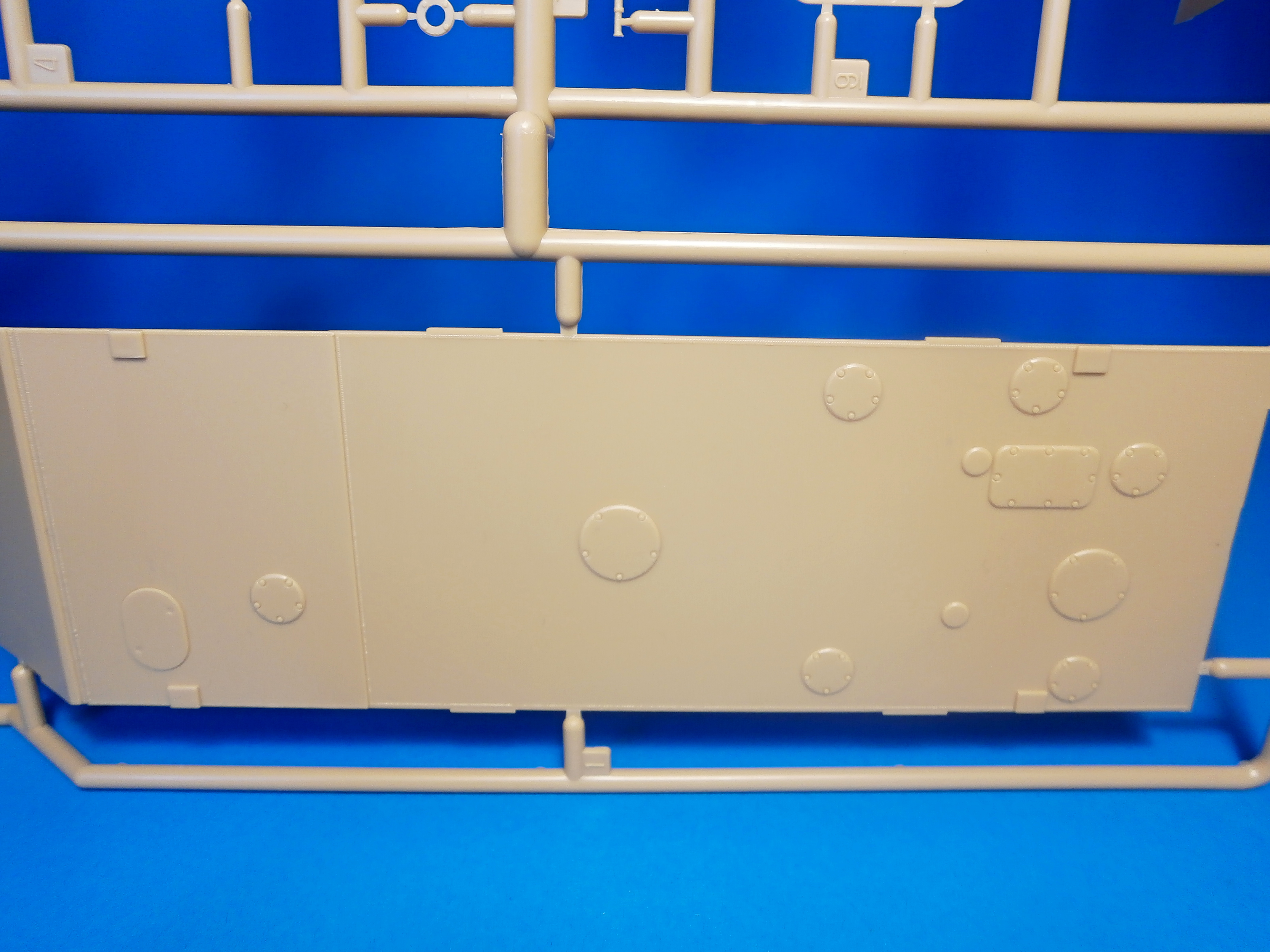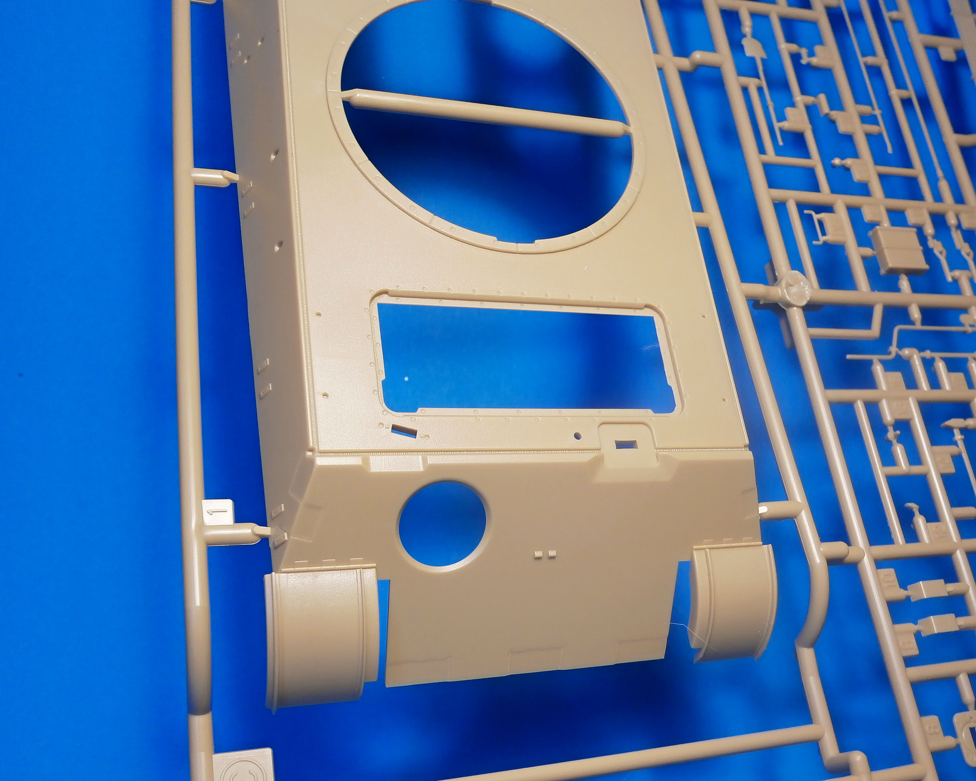 Nářadí je vylisováno zvlášť a nevypadá zle, jen by zasloužilo doplnit držáky leptem, jelikož v plastu nepůsobí příliš modelově. Stejně jsou na tom blatníky, které jsou poměrně tlusté a tak i zde by bylo vhodné najít leptanou náhradu. Na korbě i věži jsou pěkně naznačené sváry. Periskopy se do velitelské kopule vlepují zvlášť, jsou však z normálního plastu. Zde je škoda, že výrobce neudělal periskopy z platu čirého. Příliš mně nepřesvědčil kanon a úsťová brzda, která se lepí z několika částí a vytmelení nebude úplně jednoduché. Zde doporučuji sáhnout po hlavni soustružené. Výfuky a kulomety mají zahloubení a celkově působí dobrým dojmem.