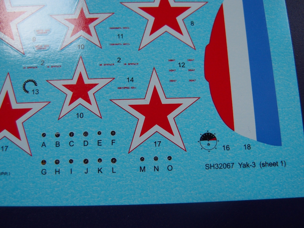 Dva obtiskové aršíky jsou vytištěny u Eduardů. První je barevný a obsahuje popisky, hvězdy, a budíky na palubní desku. Druhý obsahuje vše bílé.
