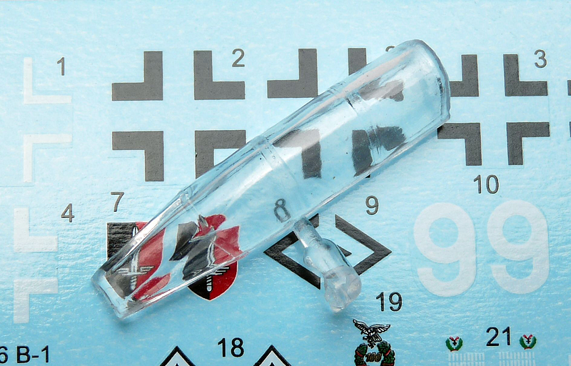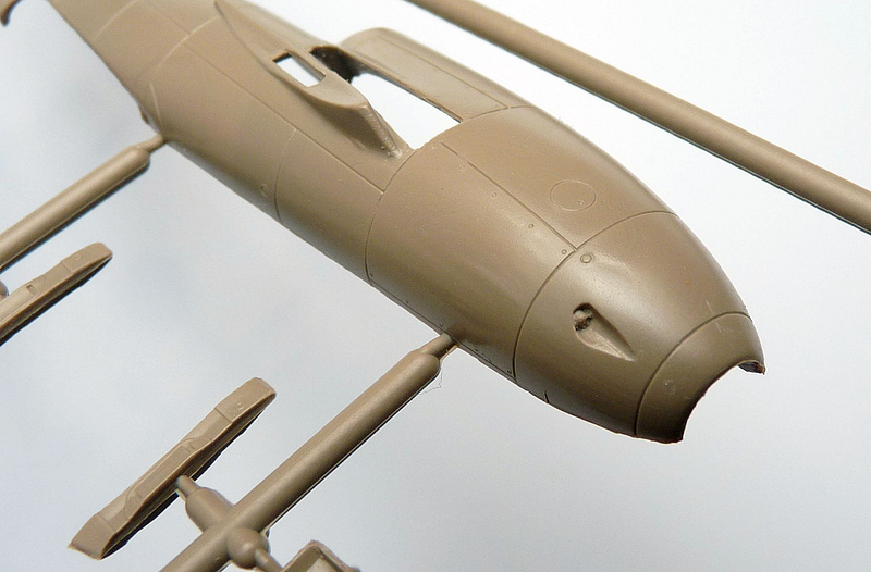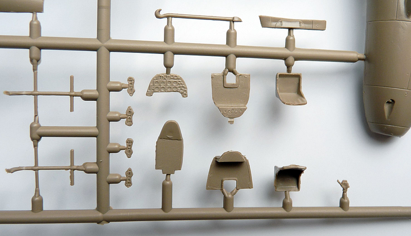 Jediný čirý díl je překryt kokpitu. Ten je vylisovaný v celku, bez možnosti otevření. Je slušně průhledný, ale poměrně dost silný, takže zkreslení je z určitých úhlů viditelné. Rámování by mohlo být výraznější a určitě mu neuškodí přeleštění.