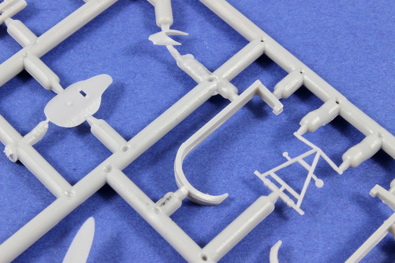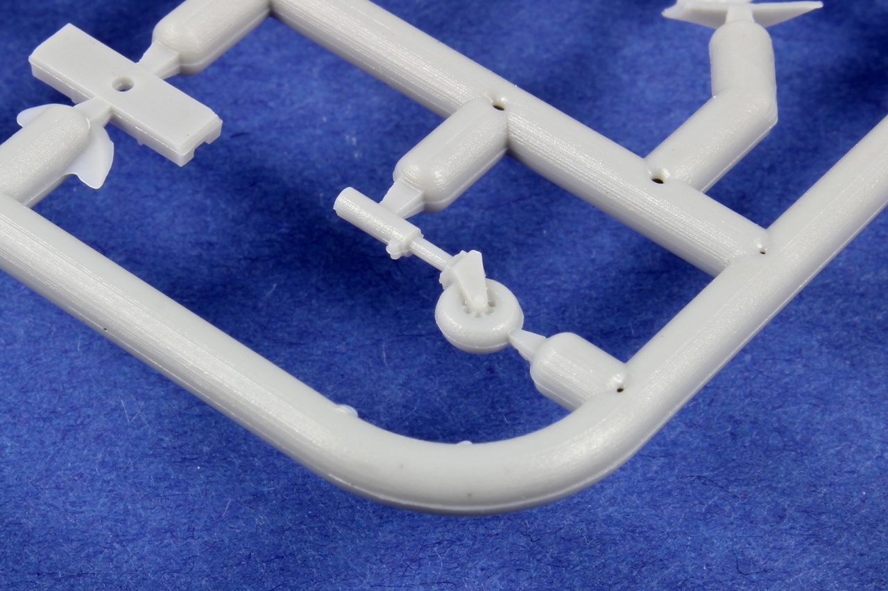 Třetí rámeček obsahuje drobné díly. Občas najdeme stejné zuby jako na dílech VOP. Některé díly jsou tak drobné, že by se mohly při oddělování od rámečku poškodit. Díl 40 je 3x, přičemž je použit jen 2x, možná kdyby došlo k poškození. Na některých dílech jsou lehké propadliny, ale na tato místa se lepí jiné díly. Na ostruhovém kolečku je vidět lehké posunutí dělící formy.