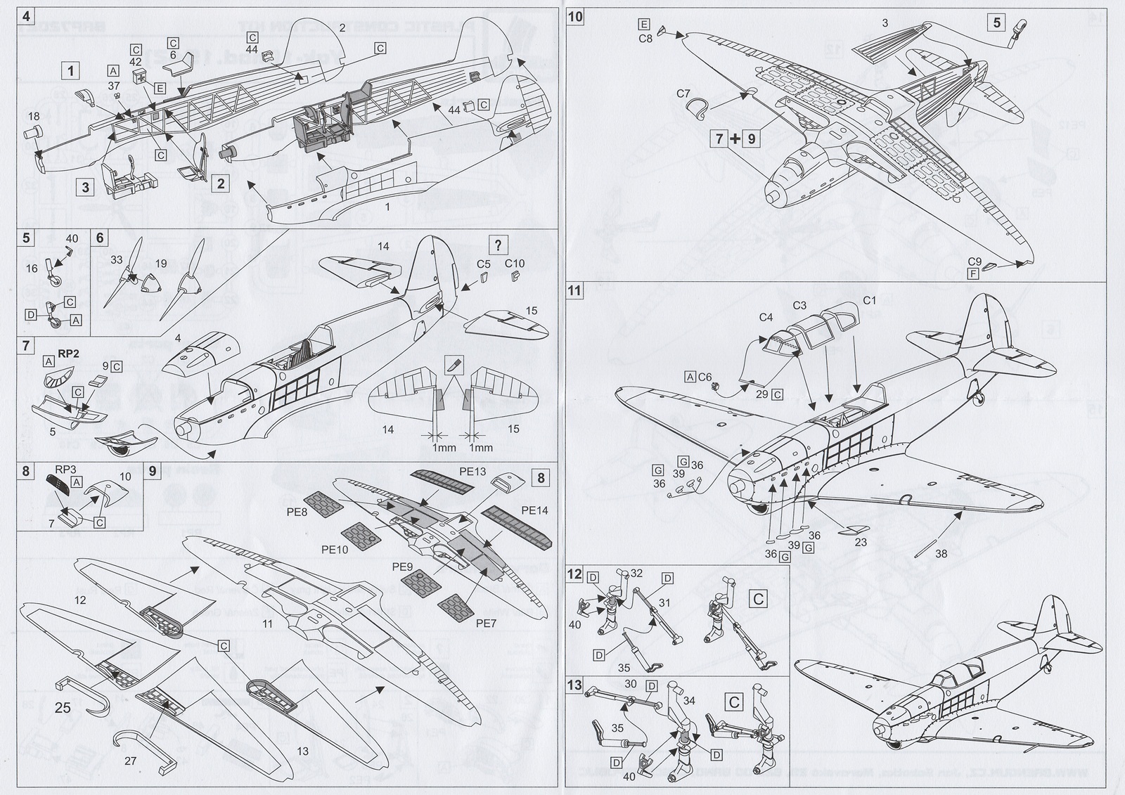 Z leptů je přístrojová deska, dva díly držáků sedačky, dvířka podvozkových šachet a díly plechů na spodní straně křídel. Díl 15 není použitý.