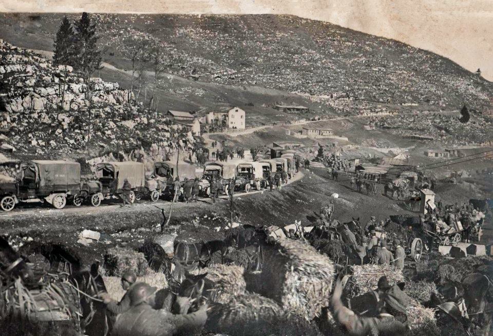 Vojáci Rakousko-uherské armády po frontálním útoku obsazují linii italských zákopů jižně od Vipacca na plošině Carso (Gorizia).