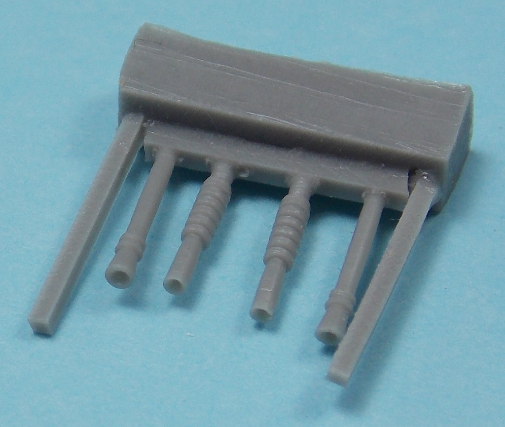 Výrobce nám přibalil dva nálitky, v jednom jsou výfuky a v druhém hlavně kanónů Hispano. Resinové díly jsou odlity v dobré kvalitě. Oddělení jednotlivých částí nebude činit žádné potíže, pokud použijeme žiletkovou pilku. Výfuky jsou dostatečně hluboké a krásně oválné. Hlavním i výfukům prospěje mírné prohloubení pomoci vrtáčků.