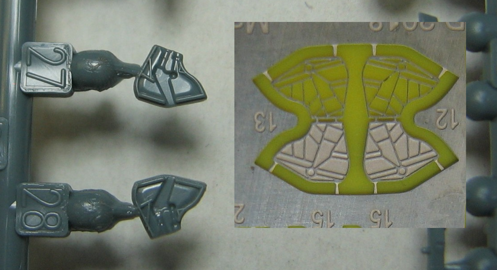 K barevnému potisku jsem se již vyjádřil, k detailům na ostatních dílech není mnoho co dodat - pěkné, funkční. Pro porovnání jsme se snažil umístit obrázek leptu k obrázku dílu ze stavebnice, aby byl vidět rozdíl. Musíte si odmyslet velikost na fotkách, ve skutečnosti mají díly několikanásobně menší rozměry.