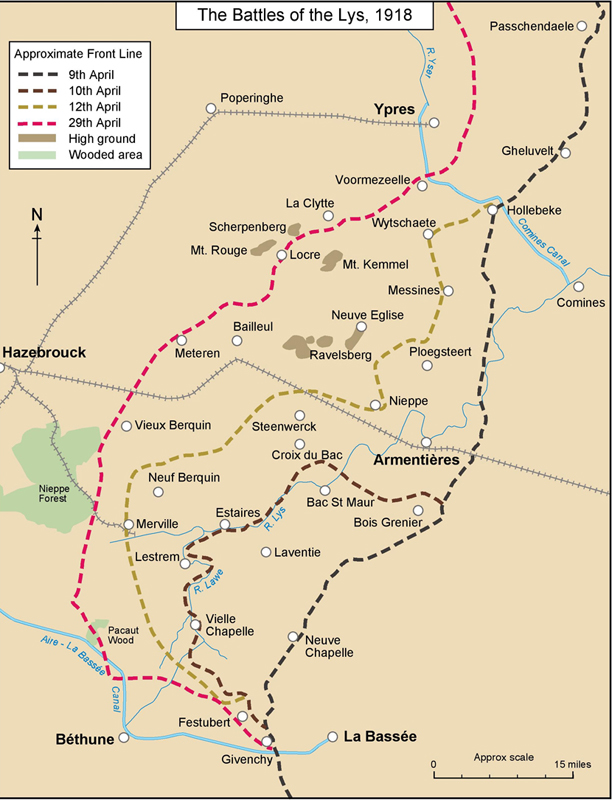 Němci pokračují v náporu u řeky Lys, po těžkých bojích obsazují vrch Kemmel, přilehlou stejnojmennou vesnici a Dranoutre.