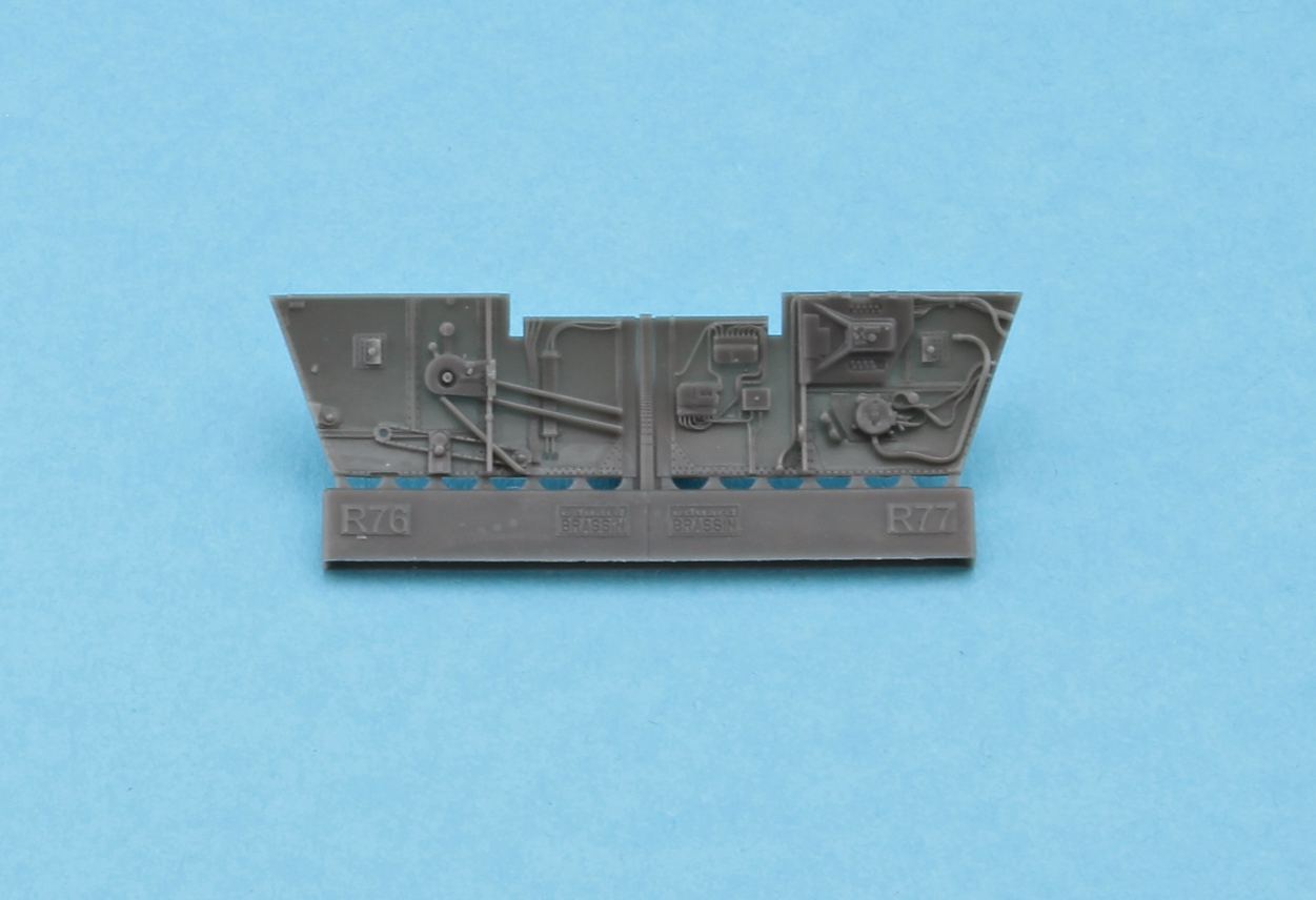 Prístrojový panel je v dieloch obsiahnutý v dvoch prevedeniach. Ad jedna krásne detailná s komplet prístrojmi do ktorých stačí nalepiť obtlačok prístrojov a zaskliť. Ad druhá, pripravená na použitie farebných plechov. Panel z ovládačmi je ale rovnako z resinu, krásne detailný.