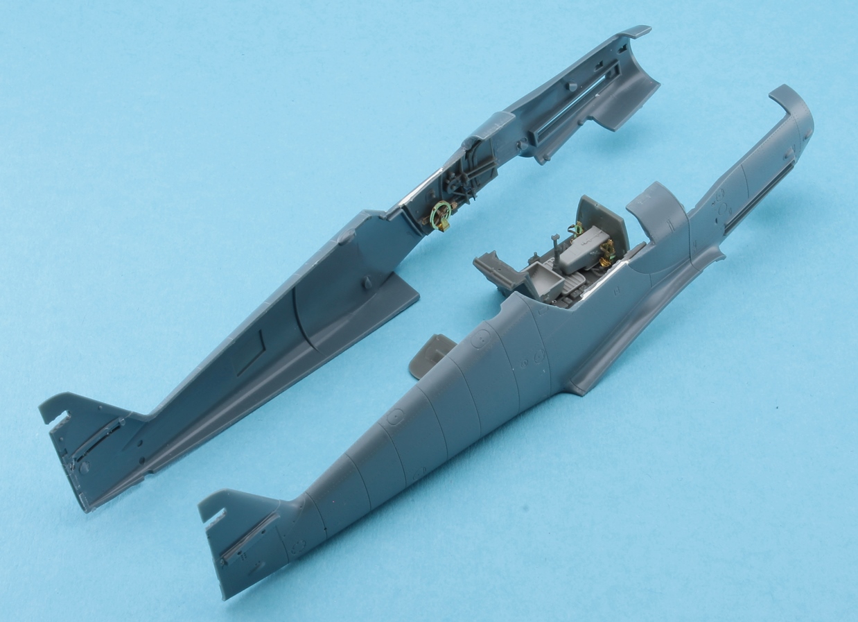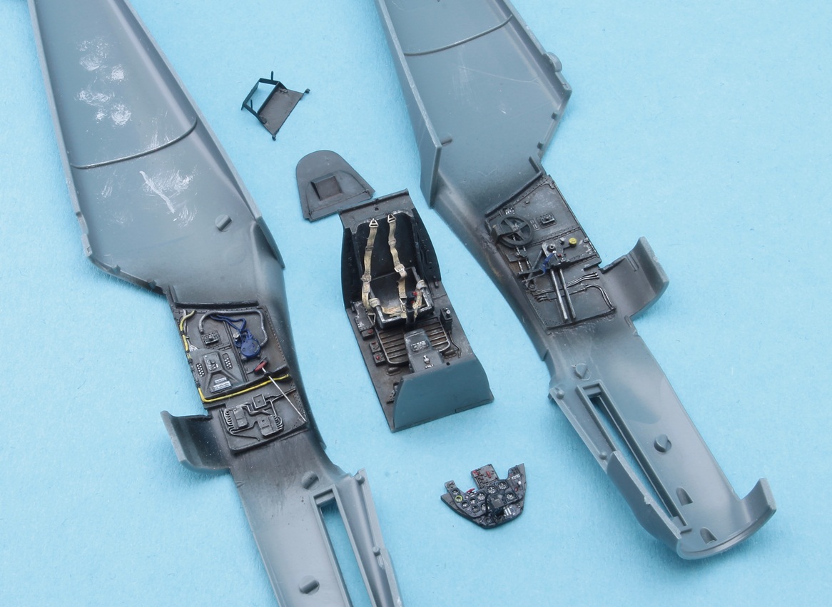 Osadený kokpit som upravil v miestach spojov tak, aby som po následnom farbený mohol vlepiť prístrovojovú dosku a zlepiť polovice trupu. Nafarbil farbami Gunze a Vallejo na štetec. Doplnil zameriavač o číre diely, upínacie pásy, popisky a farebné plechy oživili interiér.