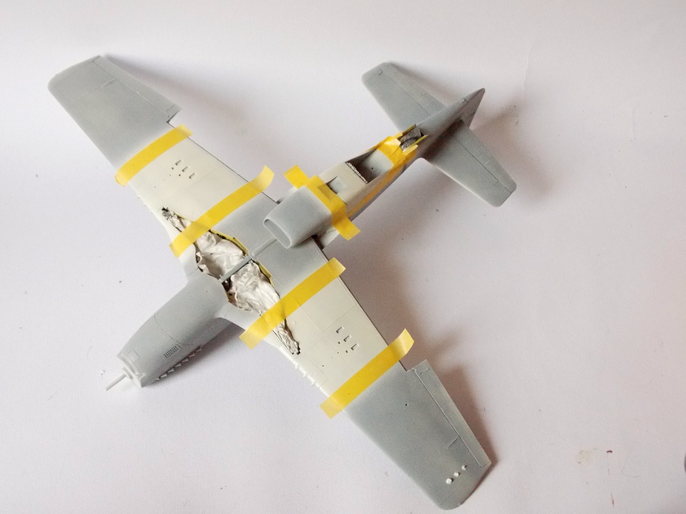 Pak už přišlo na řadu vložení sestav do poloviny trupu a slepení trupu k sobě. Spoje jsem přetmelil hustým surfacerem a zatmelil jednu z krytek dle návodu. Jako další jsem nalepil větrný štítek, který jsem měl společně s odsuvným překrytem kabiny nabarvený z vnitřní strany a tmelem dorovnal s trupem.