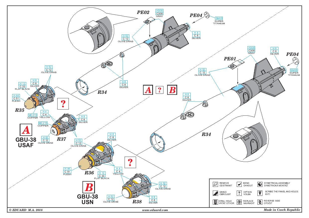 Čtveřici pum si můžeme postavit v provedení pro USAF a USN a to vždy s krytem roznětky nebo bez něj. Roznětka i kryty jsou pro různé složky letectva jiné, proto má sada těch 16 dílů přední části pumy. Kovovými díly doplníte zadní části pumy, popřípadě závěsné plošky, např. pro použití v pumovnici B-2 Spirit.