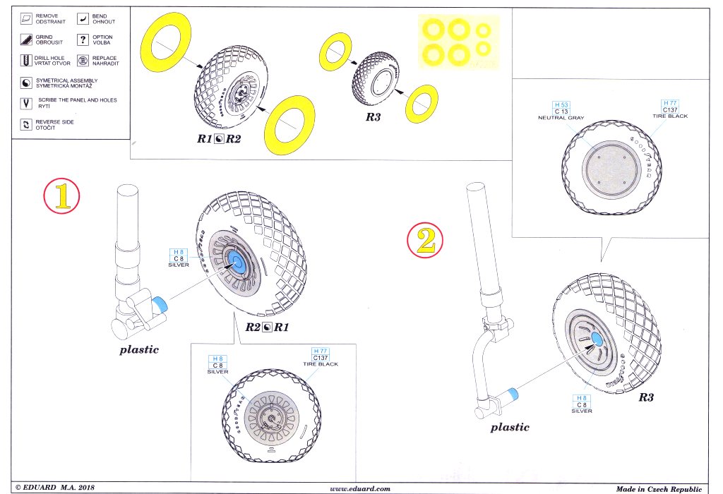Odkazuje nám určení dílů, jejích zbarvení, aplikaci masek. Ale bohužel nám nijak neusnadní rozhodování, které kolo hlavního podvozku je pravé a které levé a o nějakém upravování osy také mlčí.