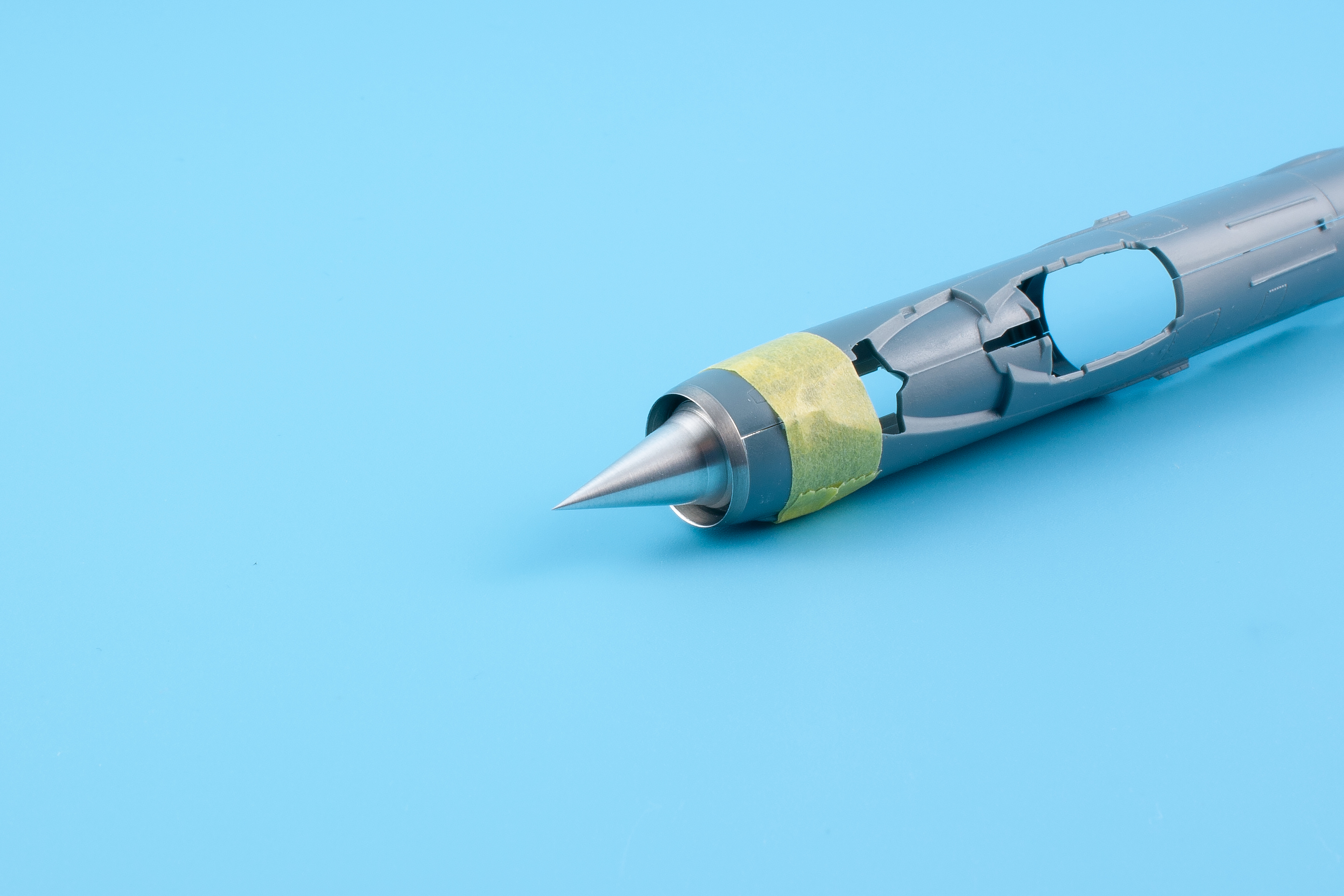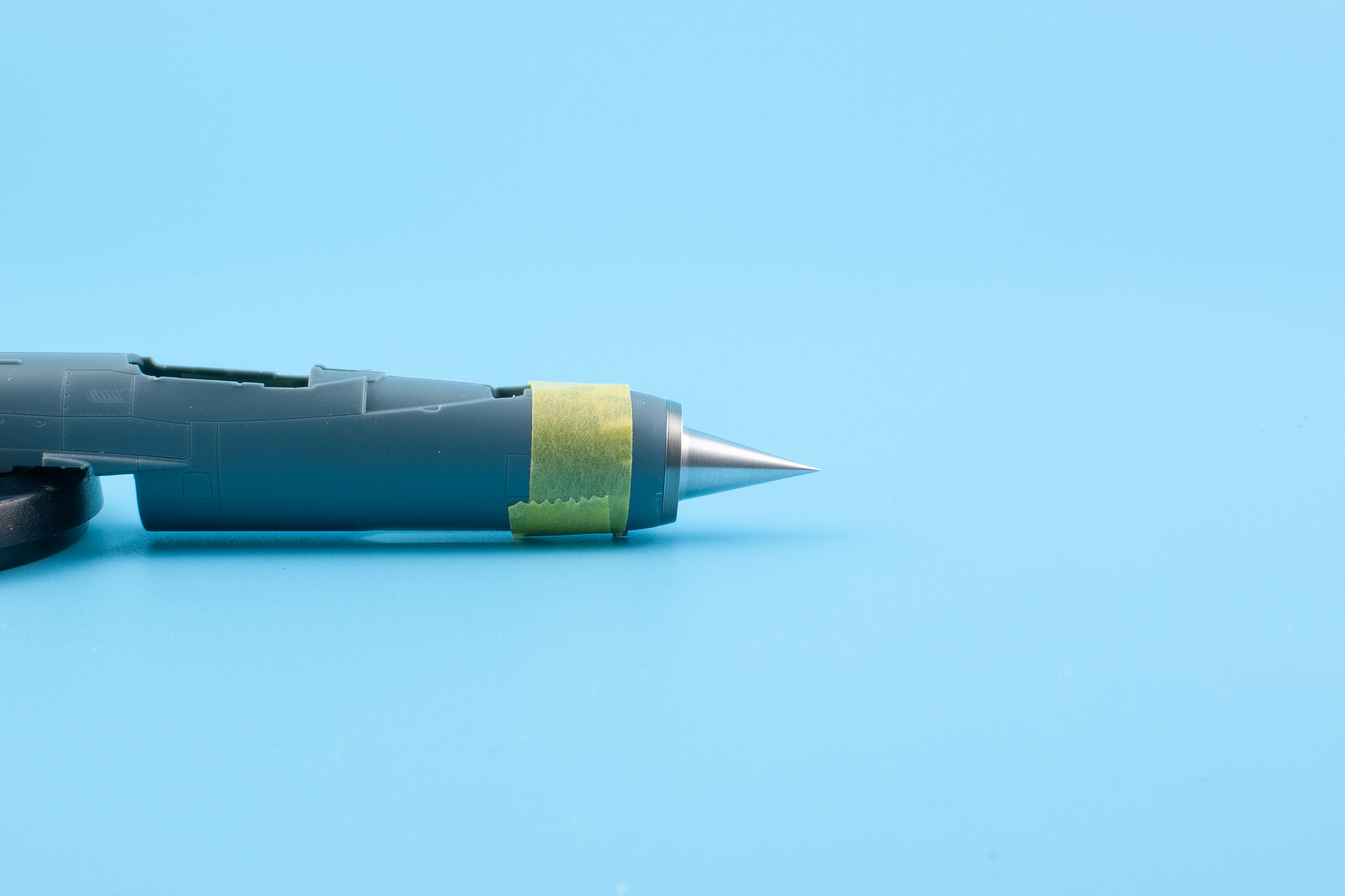 Co se ovšem upravit musí, je vnitřní stěna obou polovin trupu, tedy díly A12 a A13 u přepadové verze (Interceptor), příp. B12 a B13 u stíhacího bombardéru (Fighter-Bomber). Ztenčení plastu není nijak dramatické a s mikrofrézkou to je práce na pár minut. Druhou a zároveň poslední úpravou je odstranění usazovacích zobáčků na vnitřním usazovacím dílu D68, do nějž kužel pasuje jako ulitý. Prstenec se po slepení trupu vsune na místo, přičemž sahá až k usazovacímu dílu, ani při nejlepší vůli pak není vidět jakákoliv spára. Nakonec je třeba vlepit samotný kužel.