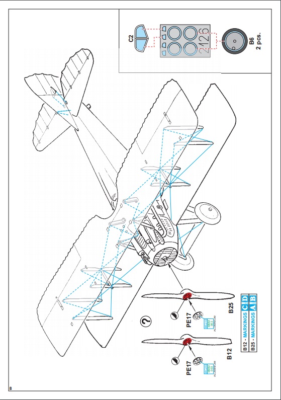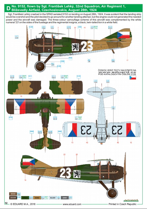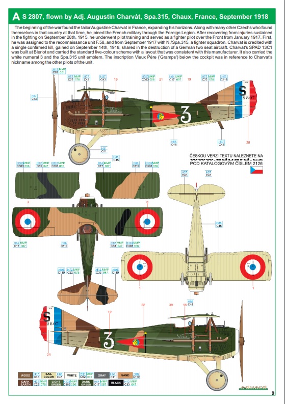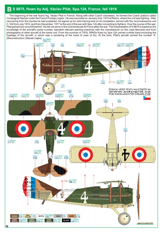Návod na stavbu je barevný – mírně přehledný. U kamufláží zamrzí absence českého textu. Kamufláže jsou různě barevné a modelář bude mít těžkou volbu se zvolením barevné varianty. V návodu máme čtyři různé mašiny ve standardním francouzském schématu, co kus to originál. Dva stroje jsou válečné, kdy jsou prezentovány jako stroje na kterých létali čs. letci Adj. Augustin Charvát a Adj. Václav Pilát, další dvě kamufláže nabízejí stroje čs. letectva s praporovými znaky. Liší se jinými tvary kam. ploch, pestrostí doplňků kamufláže. Viz přiloha.