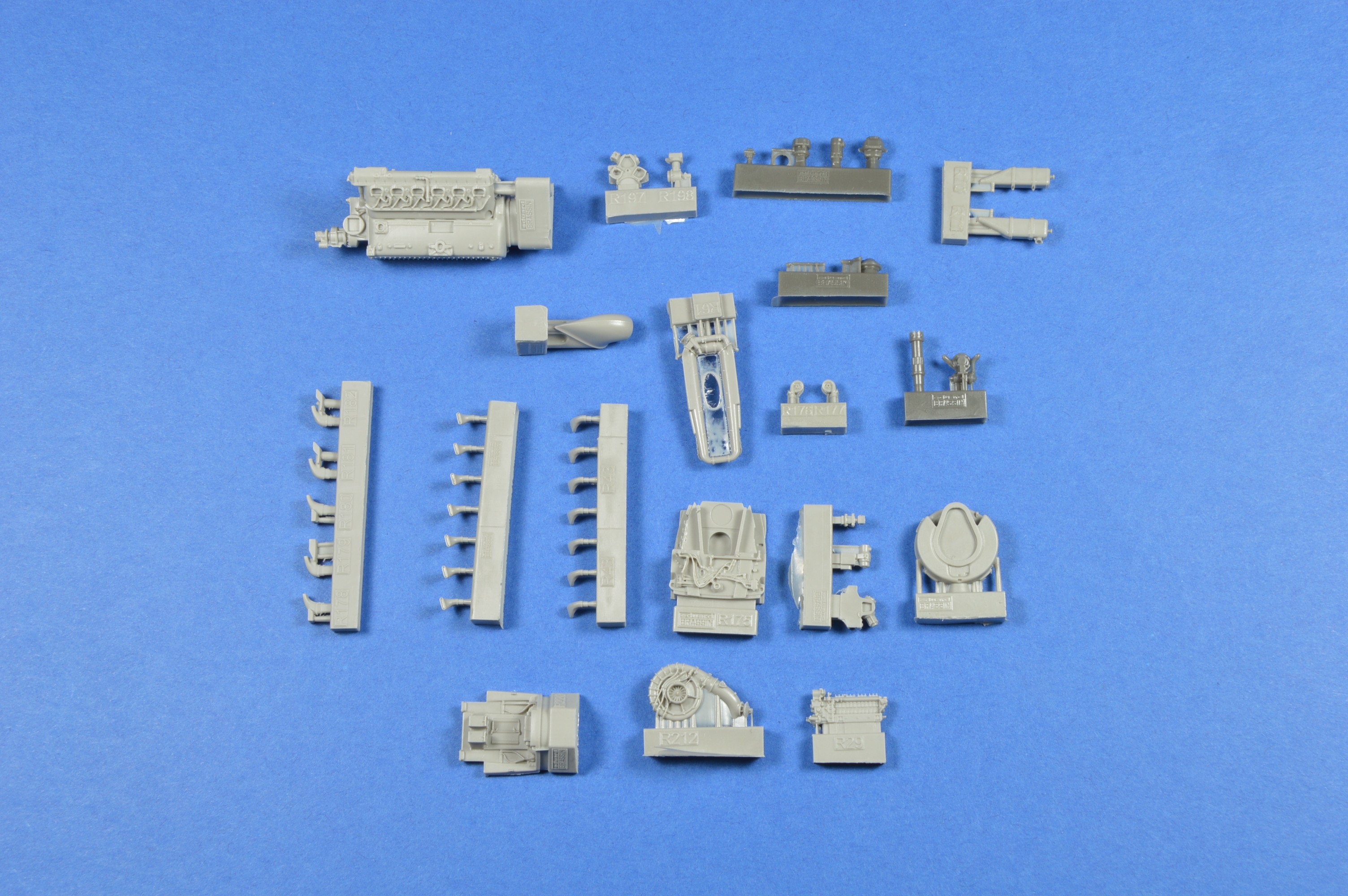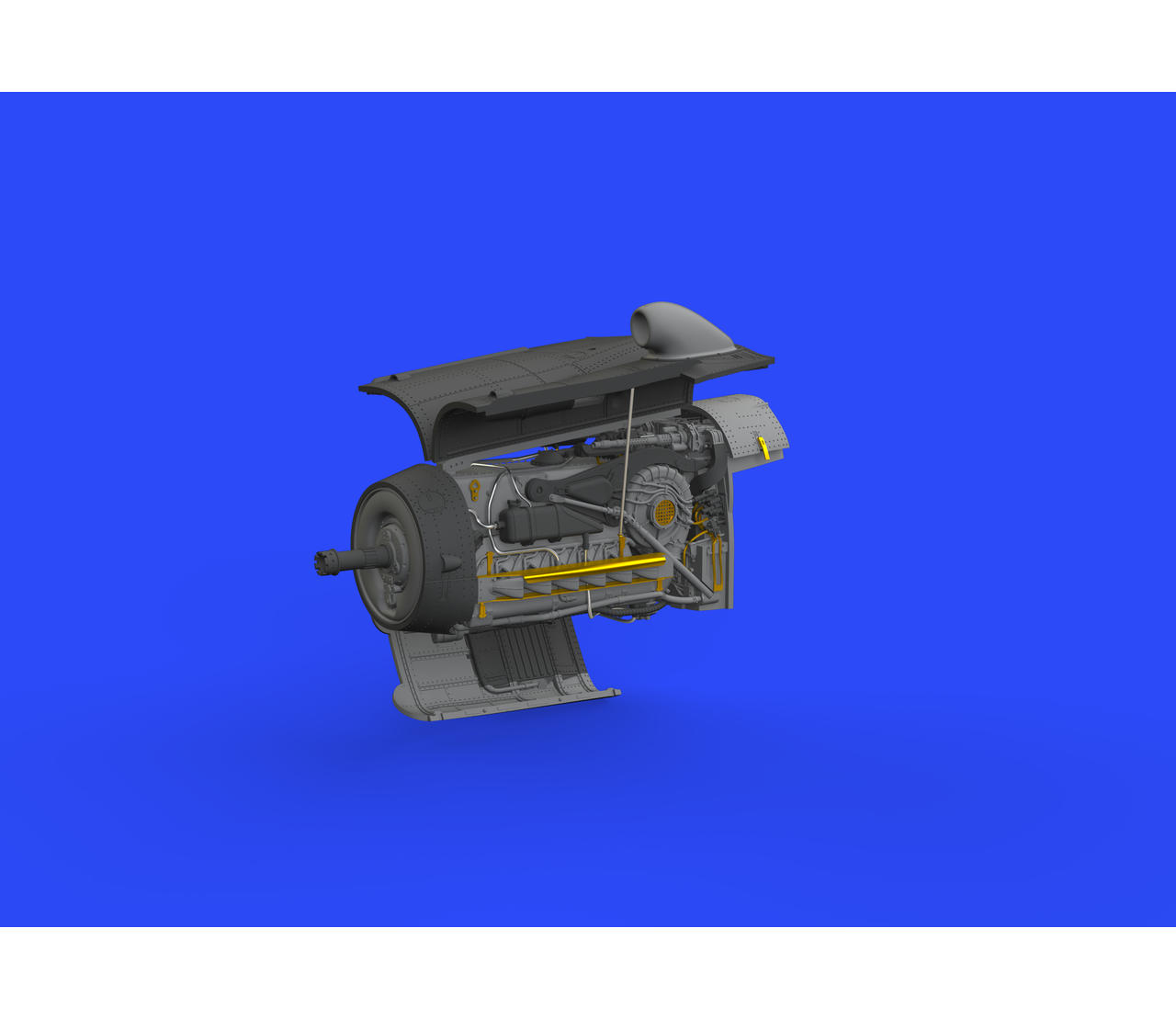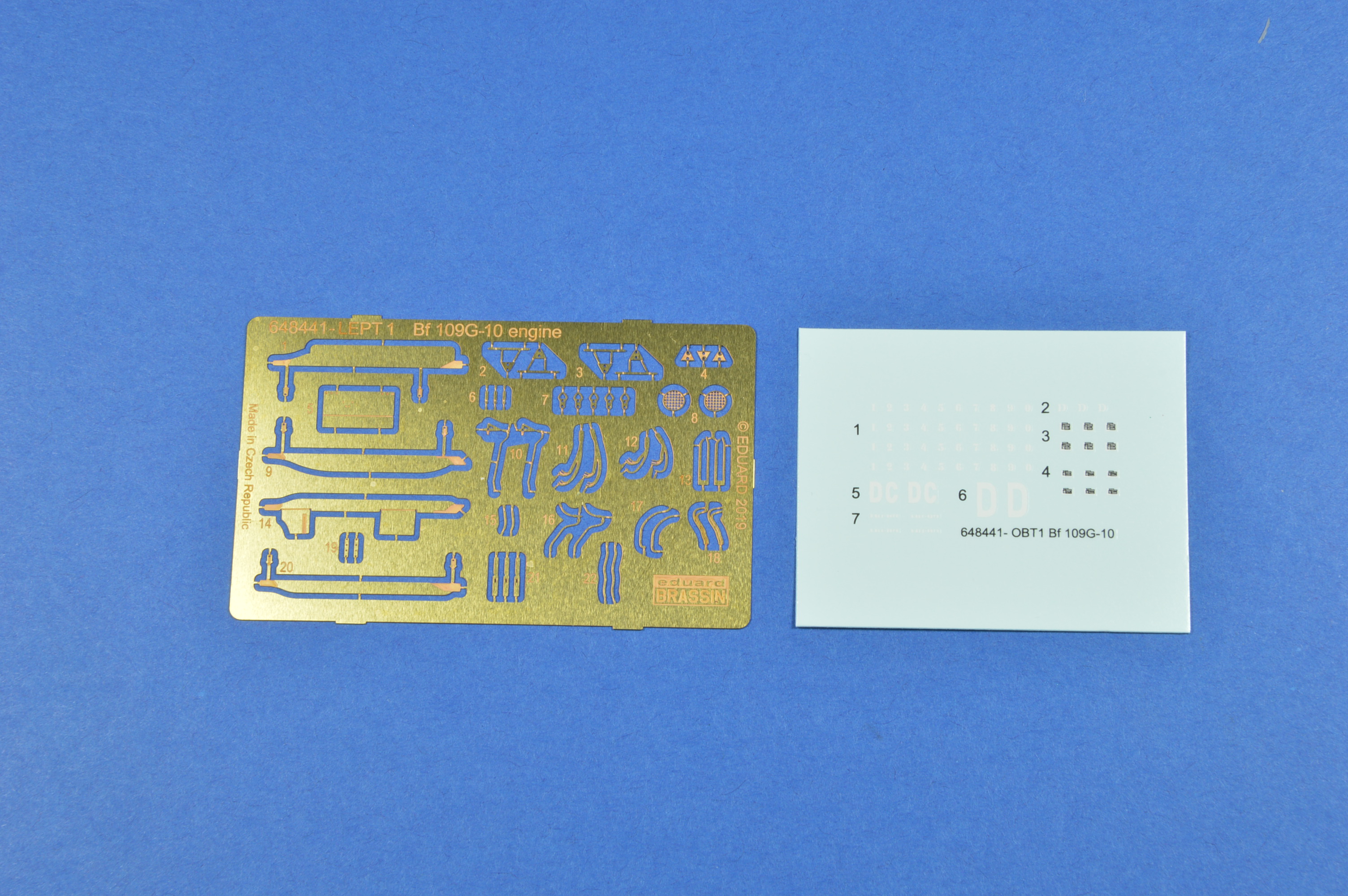 U této sady je novinkou, proti starším motorům určené pro Bf-109, otevřený spodní motorový kryt. Motor je tak kompletně otevřený. Sada obsahuje také kovové díly, z kterých využijeme plechy kolem výfuku a držáky kulometů. Zbytek jsou kablíky, které jsou sice použitelné, ale je lepší nahradit ploché provedení kabelů olověnými drátky. Poslední věcí jsou obtisky s čísly a písmenem pro označení motoru.
