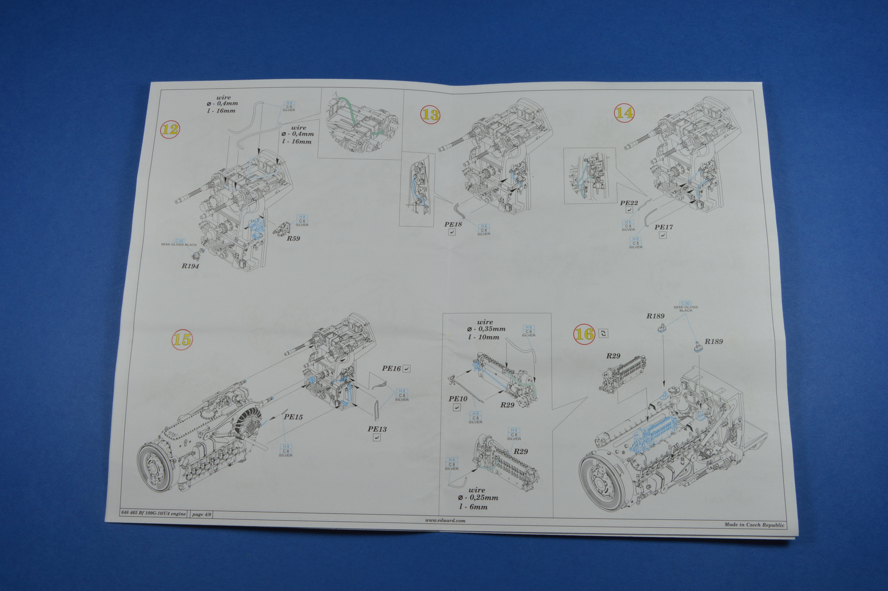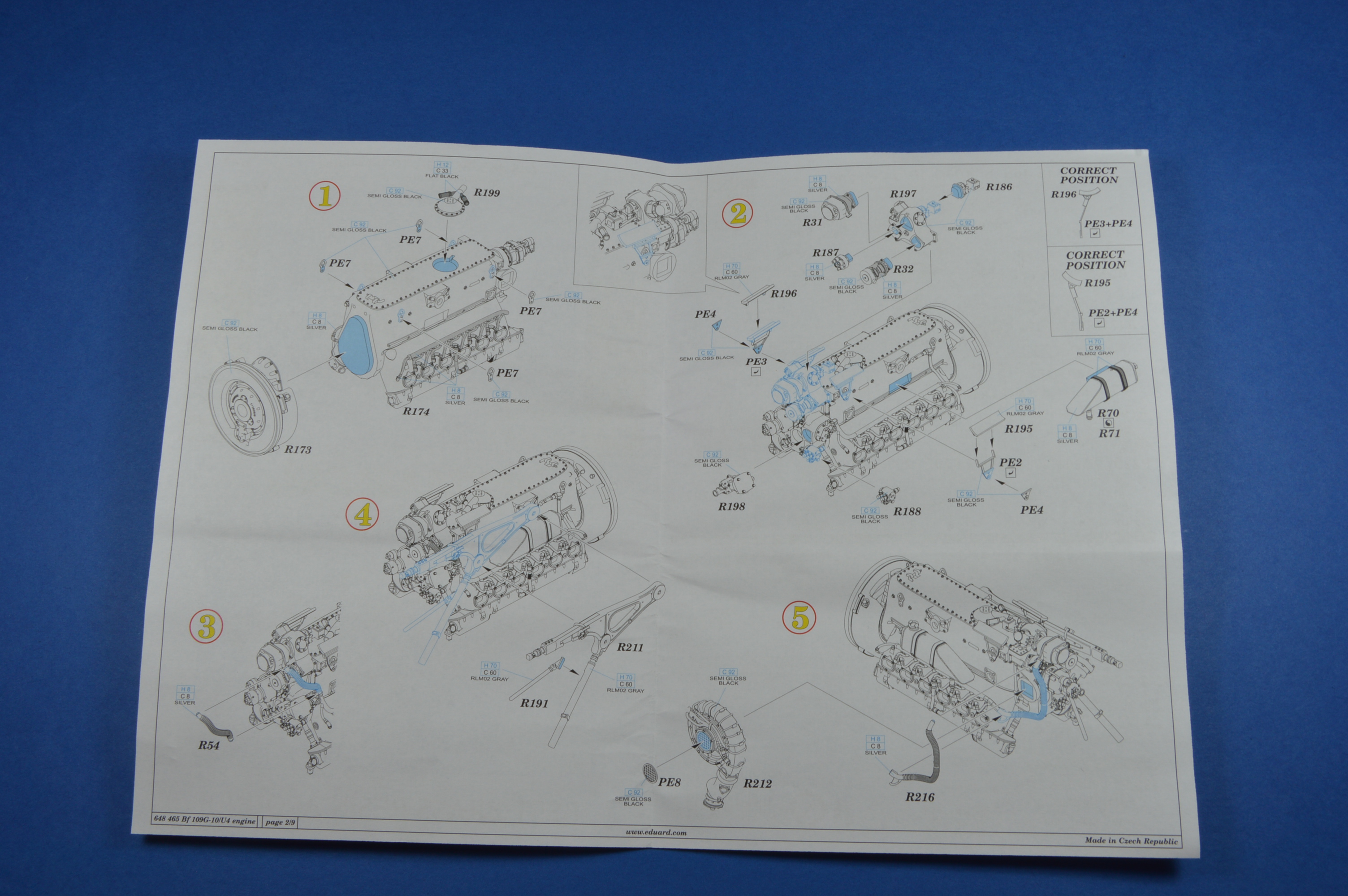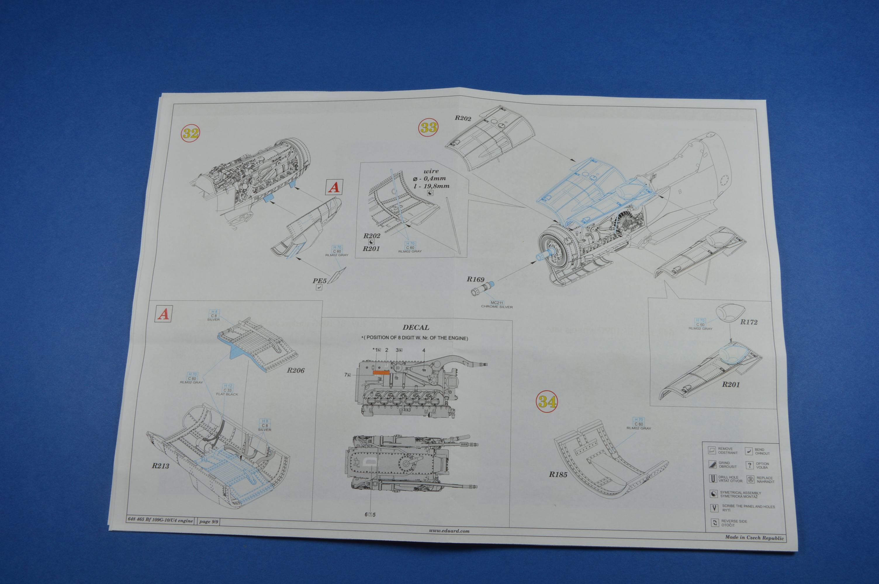 Eduardí návody jsou čitelné a vedou modeláře krok za krokem. Čeká nás celkem 34 kroků. Návod nám přesně řekne, co je třeba obrousit a jakou má mít díl barvu. Návod nás vede k tomu, abychom slepili prvně motor a následně ho nasadili na motorovou přepážku R175 a nakonec celek vlepili do trupu.