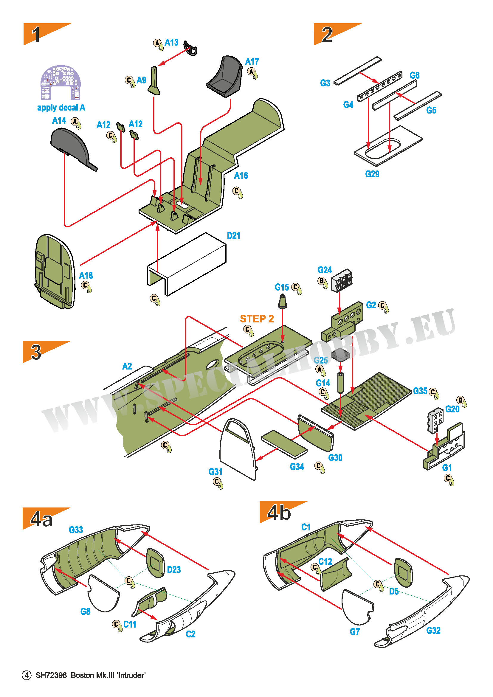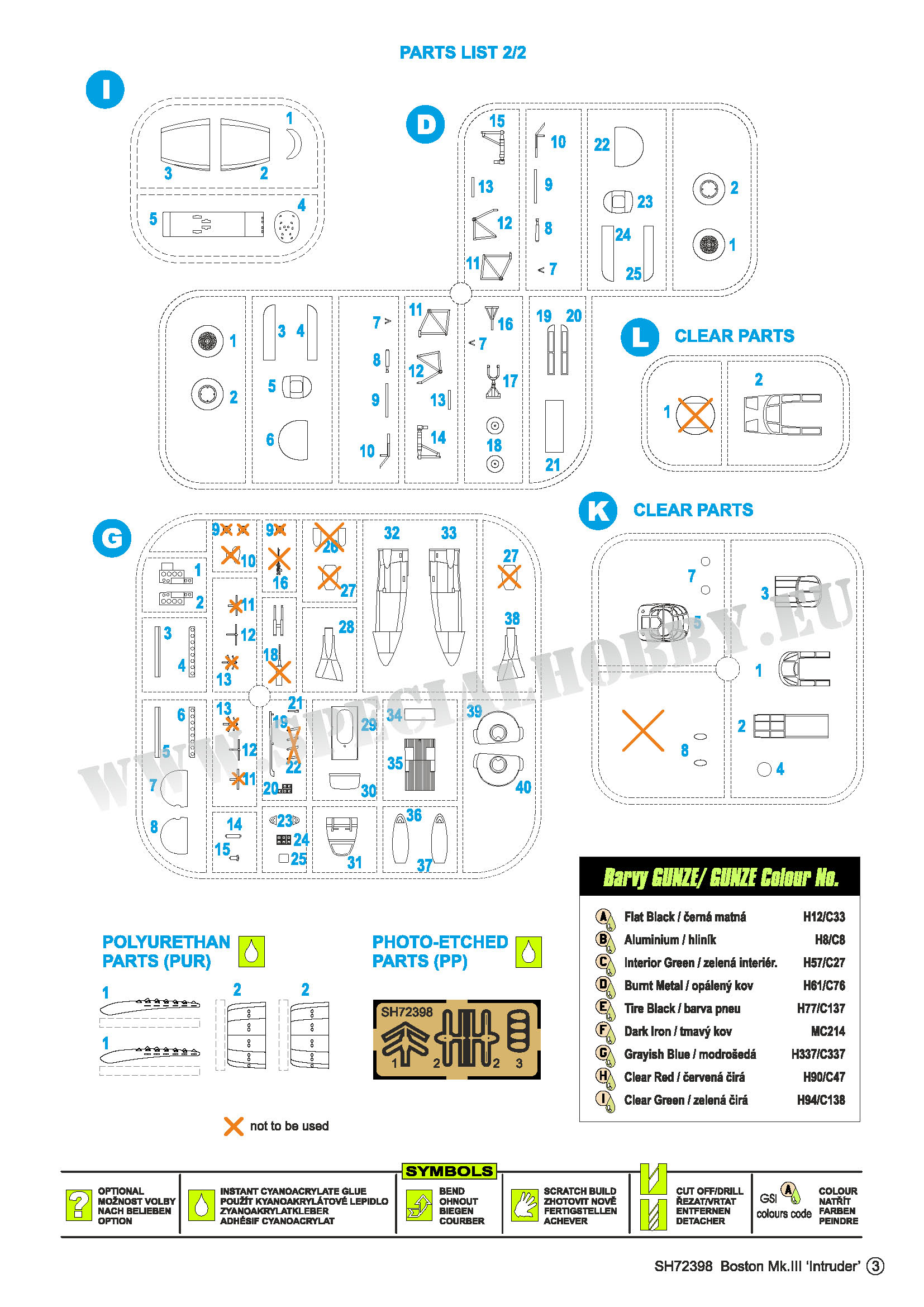Na úvod by som chcel upozorniť že aj keď je označenie na krabici MK.III - čo je stroj s preskleným predkom, stavebnica ponúka aj diely a dve kamufláže na MK.II kde je plný predok!!! Plnofarebný návod má 12 strán formátu A5. Ponúka krátku dvojjazyčnú históriu, rozstrel rámikov, samotný popis stavebného postupu s označením farieb pod zostáv.