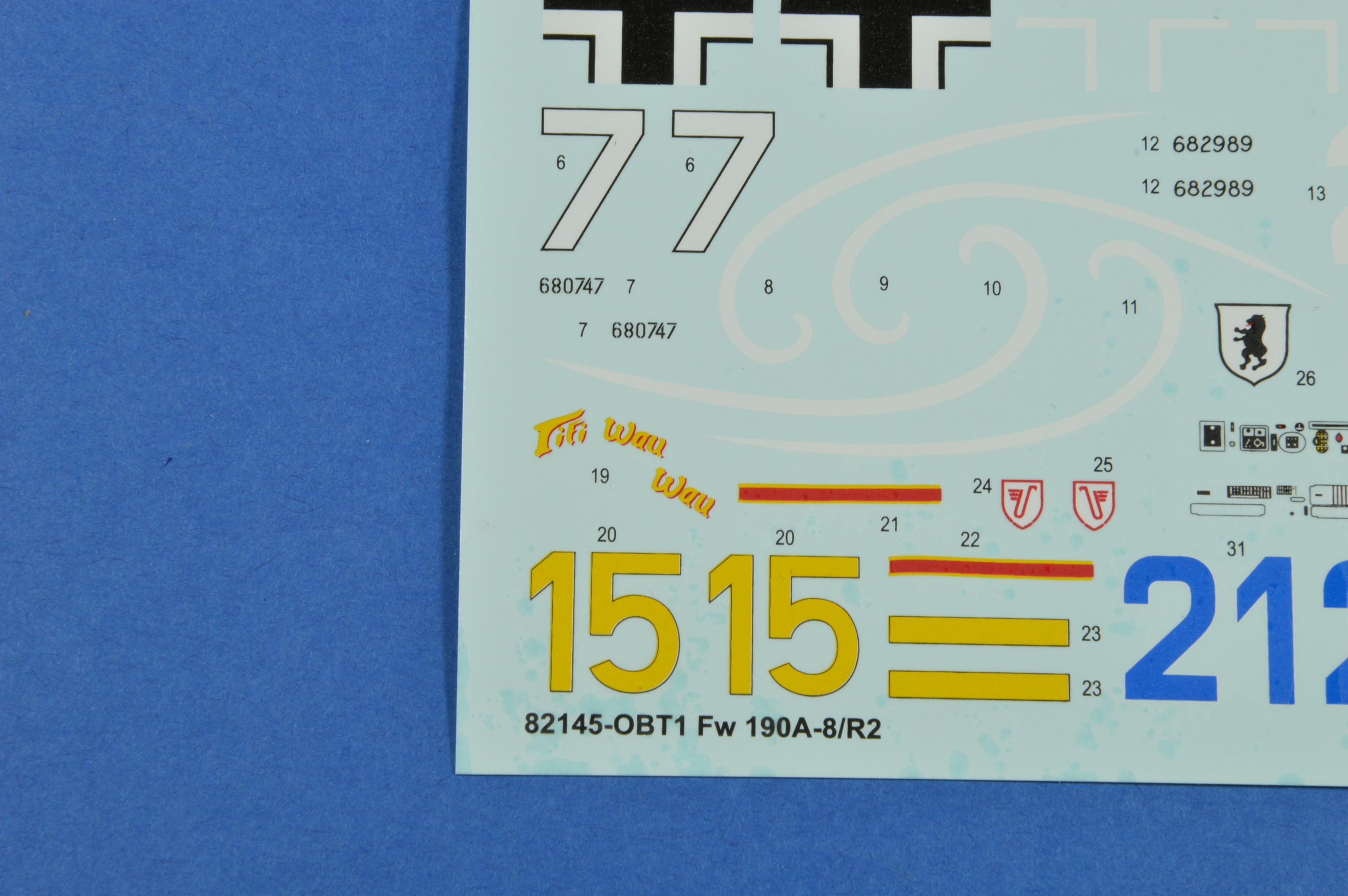 Obtiskový aršík obsahuje dva aršíky pro pět kamuflážních schémat. Obtisky jsou výroba Eduard. První obsahuje kompletní označení pro všechny stroje, druhý aršík obsahuje popisky.