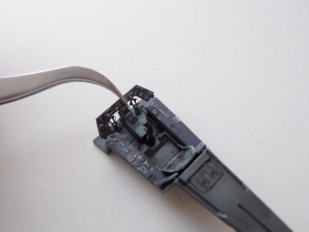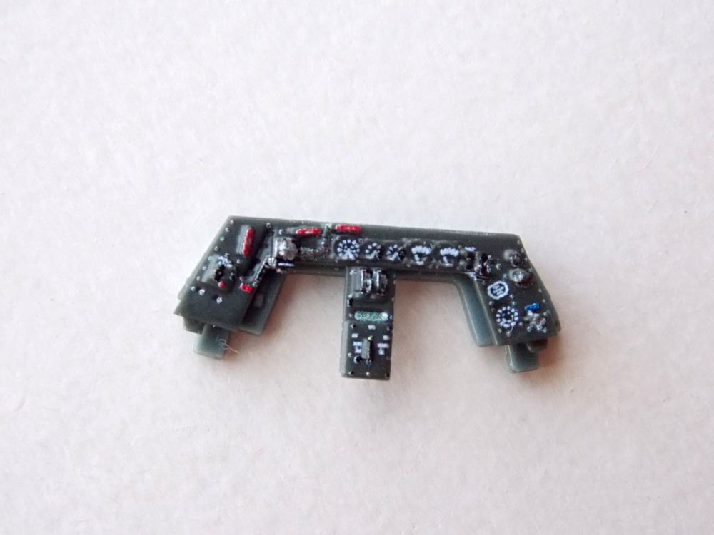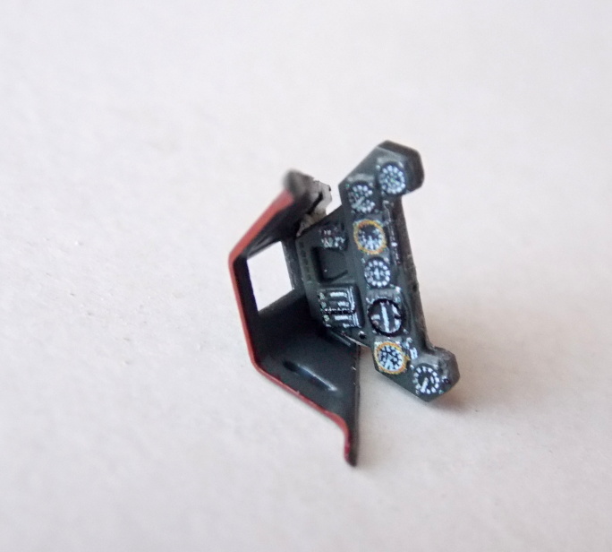 Díly palubní desky jsem odřízl žiletkovou pilkou z nálitků. V momentě, kdy jsem chtěl spodní díl palubní desky přilepit k vaně kokpitu, jsem zjistil, že usazovací kolíky jsou umístěny jinak než je tomu na dílech ze stavebnice. I u horní části palubní desky jsem zjistil, že má jiný tvar a rozměry, než ta co je ve stavebnici. Nicméně, toto nám nikterak nebrání v umístění sady do modelu.