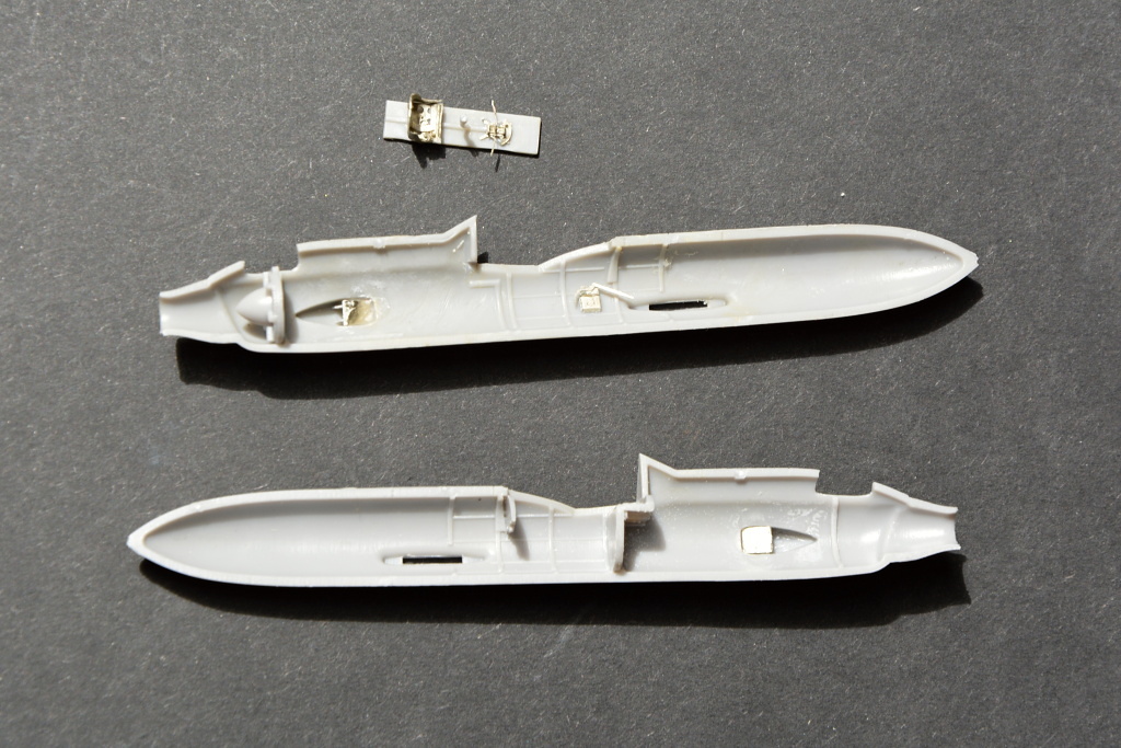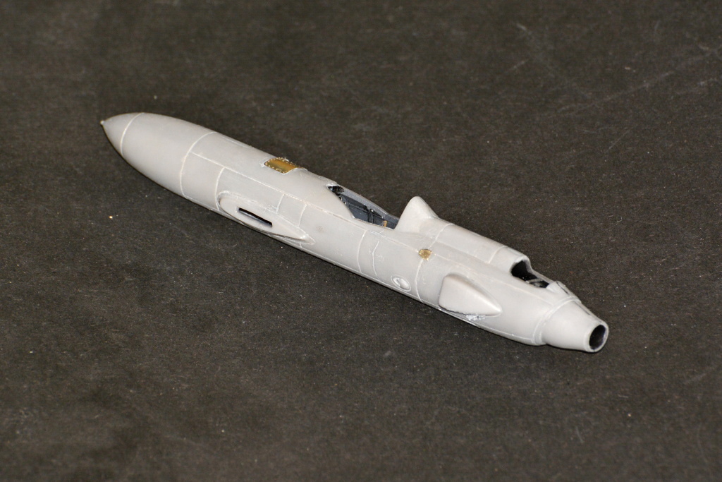 Tradičně byla stavba zahájena slepením kokpitu. Ten originální ze stavebnice není příliš detailní, proto už zde přišly na řadu plechy ze sady BRL72166. Ty nabídly mnohem detailnější nožní řízení, sedačku včetně pásů, přístrojovkou desku a menší přístrojovou skříňku do levé půlky trupu. Z původního kokpitu se tak použila pouze podlaha a knipl. Deska z leptu by se měla plně zaměnit za tu plastovou, já mám ale raději jistotu pevnějšího spoje. Proto jsem z plastové desky obrousil reliéfy budíků a na ní nalepil plechovou náhradu. Kokpit je doporučeno nabarvit tmavě šedou barvou, já měl zrovna po ruce zesvětlenou tamiyu XF24. Po zalepení kokpitu, turbíny a leptaného žebrování sacích otvorů byl trup připraven k uzavření. Do čumáku ještě přibyla menší doporučená zátěž.